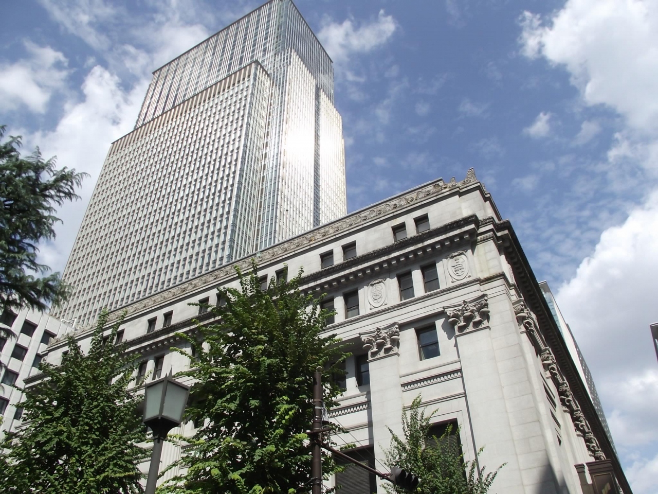 この三井タワーは、遠くから見るとスマートな超高層ビルだが、近くで見ると隣接している三井本館との調和が良く、綺麗な街並みとなっています。