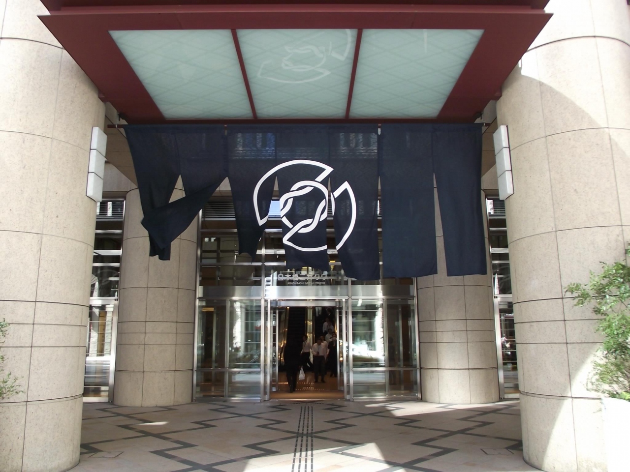 近代的ビルにのれんが懸かった玄関を入ると、そこは、アトリウムになっており、吹抜けを見上げれば、華麗なステンドグラスが目に入って来ます。