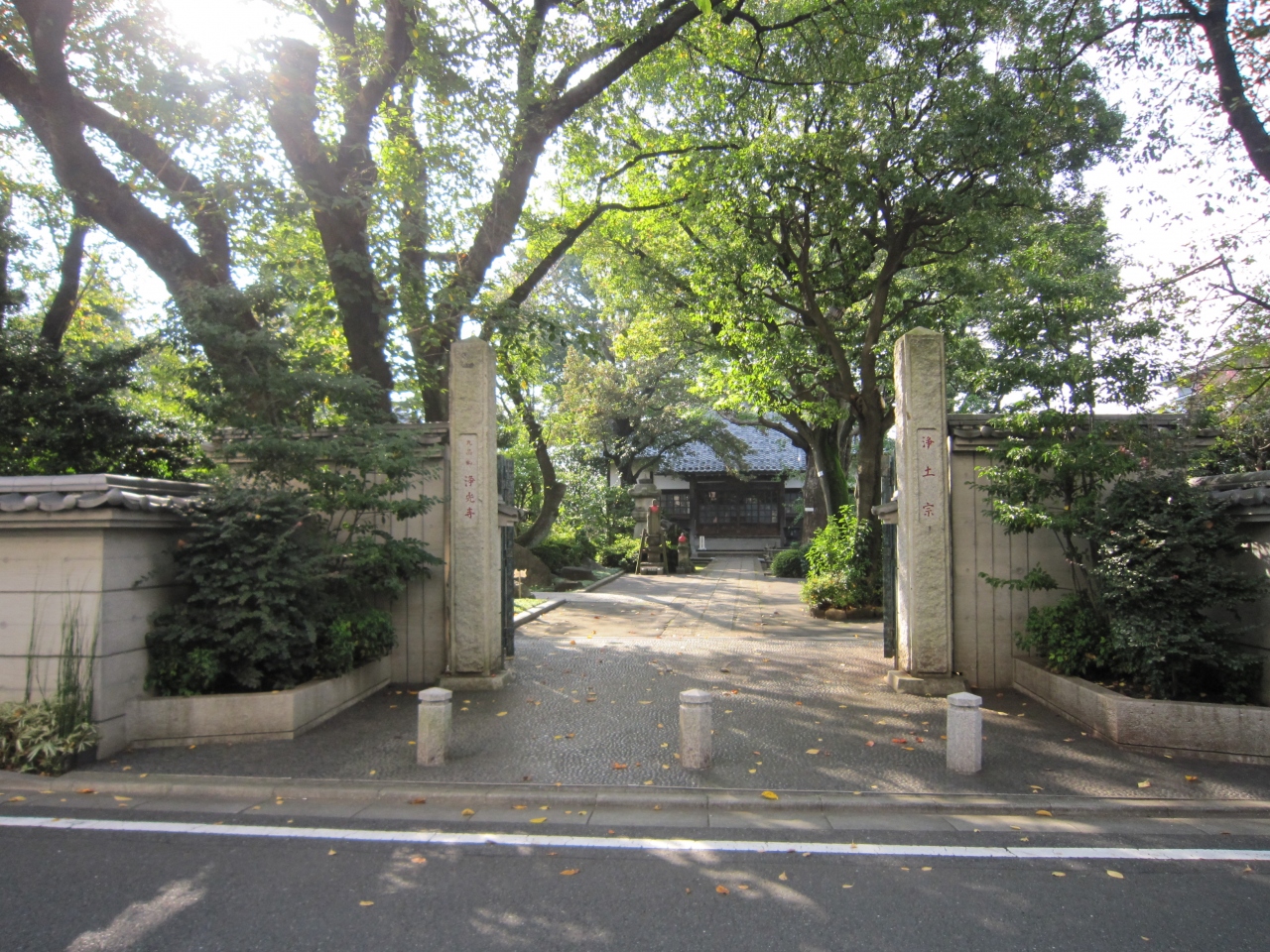 渋谷から世田谷通りのバス停「上町」で降り、御菓子屋ニコニコ堂を右折しボロ市通りを横切り突き当たって左そして右に行くと正門があります。上町から5分位です。正門を入ると2体のお地蔵様が迎えてくれます。正面が本堂、左に観音堂、本堂の左奥に広い墓地があります。また境内には桜の大木等樹木が沢山あり、サンシュユの木が世田谷区から保存樹林として指定されていました。住宅街の中で正門前はマンションですが、沢山の樹木があり、春は桜が咲き綺麗でしょう。