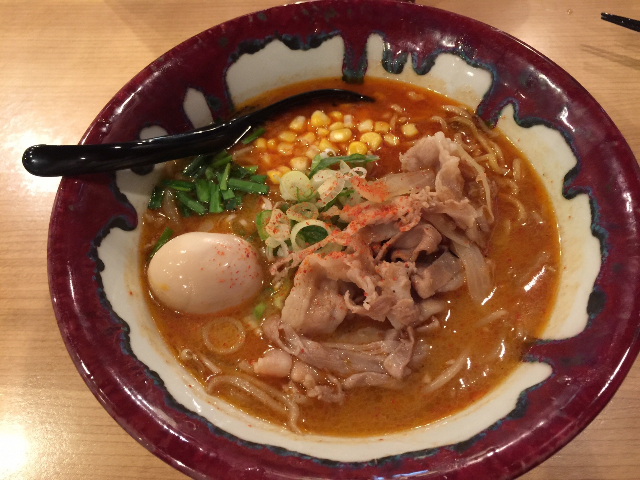 正直期待していたよりは普通だった。私は辛いラーメンで、連れは普通の味噌ラーメンを。味噌ラーメンのスープを飲ませて貰ったがカレーみたいな味。替え玉注文したが忘れられて、催促してやっときたが、冷めたスープでは美味しくなかった。