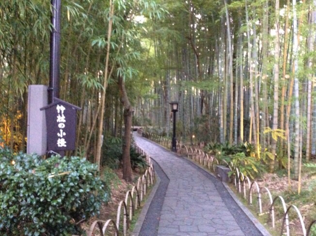 修善寺温泉の老舗新井旅館の裏手で桂橋を渡って温泉街へ行く途中にありました。京都 嵯峨野の竹林をイメージするとちょっと期待はずれですが、それでも竹林に囲まれた石畳みの散策路は気分が和みます。付近の温泉宿から浴衣と丹前姿で散歩に来ている人たちがほとんどでした。