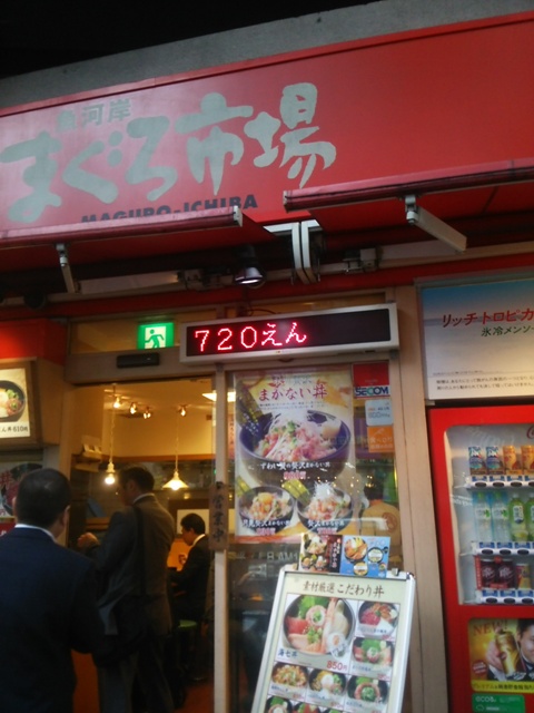 新橋駅から有楽町・銀座方面に北上し、ヤマダ電機の向かい側にあるお店です。マグロを使った海鮮丼が中心で一番安い漬けまぐろとアナゴなどが乗ったセットが500円です。同じ店舗が立川や水道橋、小川町などにもありますが、この店だけご飯の大盛りがプラス50円でした。他の店は大盛り無料サービスでしたが…