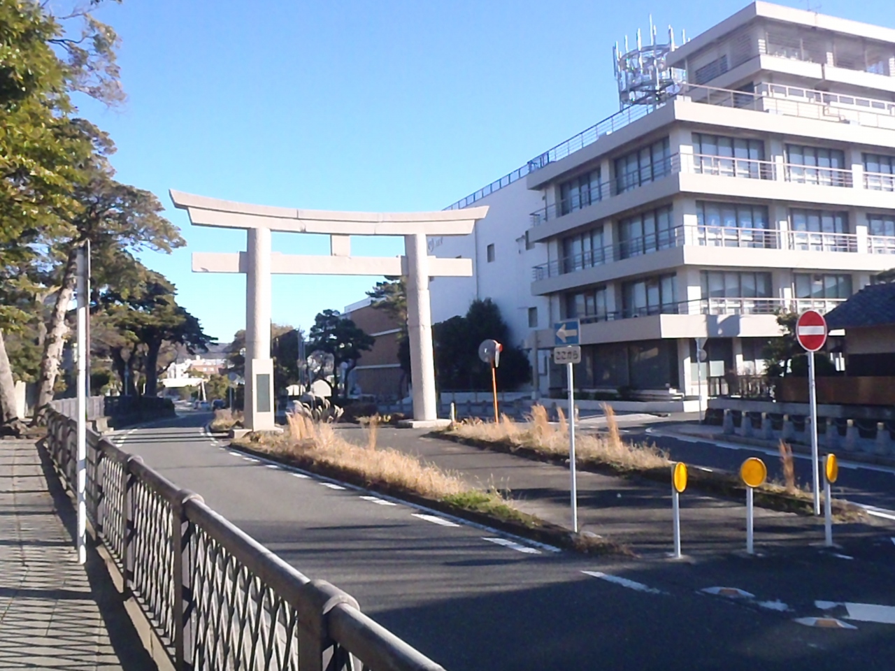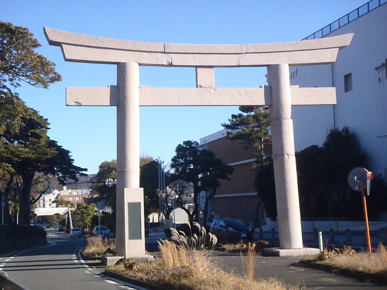 相模湾に面した由比ヶ浜海岸から約600mほど鶴岡八幡宮表参道若宮大通りを建つ鳥居です。