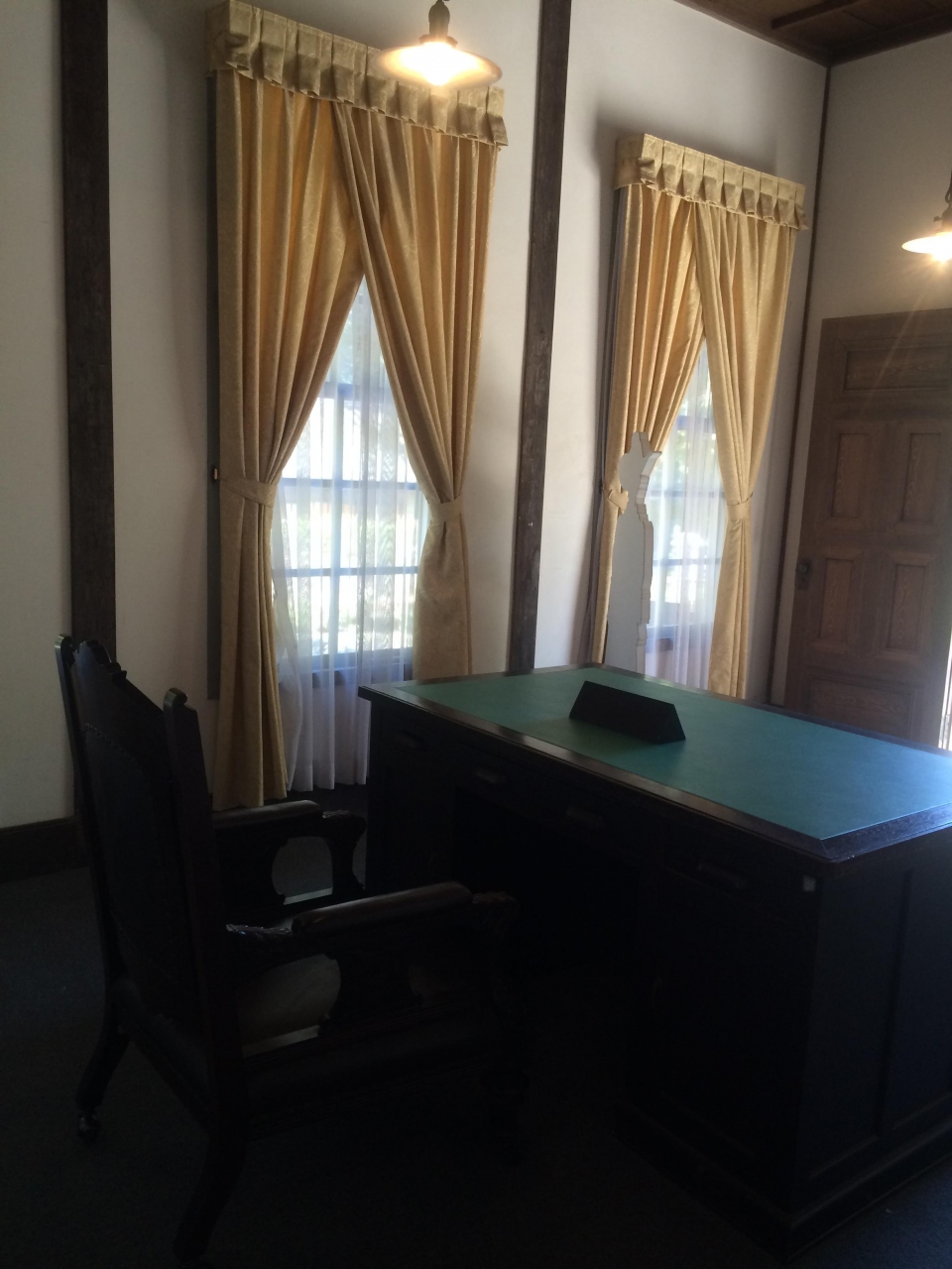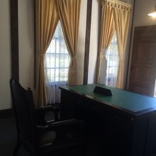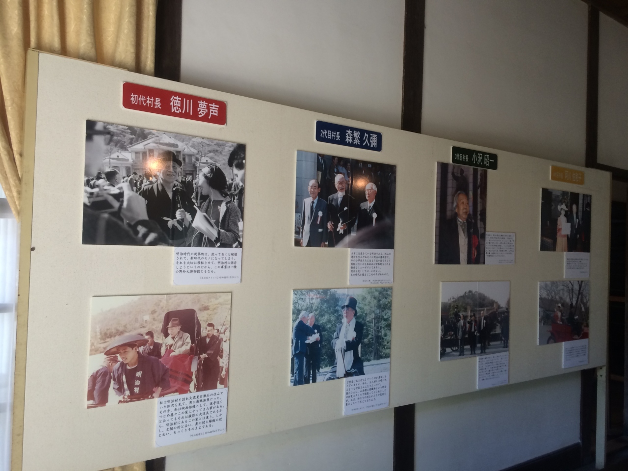 明治村二丁目レンガ通りの突き当りにある、山梨県にあった村役場です。とても絵になる場所です。ここには明治村の村長室があります。現在四代目村長は阿川佐和子さん。パネルの村長とツーショット撮れます。歴代の村長さんのパネルもありました。