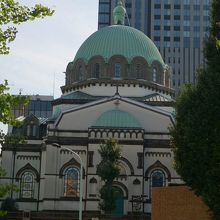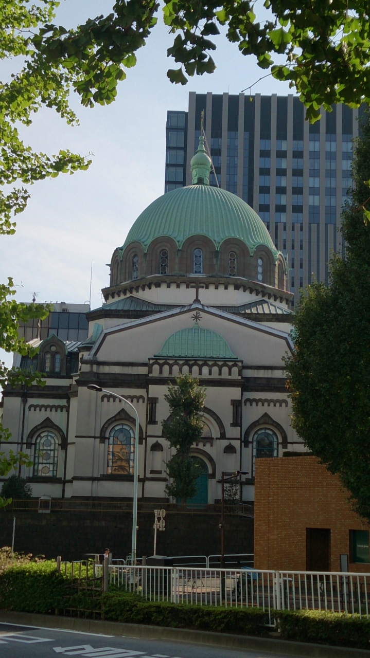 神田・お茶の水界隈は多くの、文化施設や宗教施設が集まっていますがその中でも、ぴか一に存在感を発揮している建物がこのニコライ堂だと思います。御茶ノ水駅の聖橋口を出てすぐに見える姿は、ドーム型の様式の教会建築で、教会建築は全国各地にたくさんありますが、非常に珍しいと思います。青銅色のドーム型の屋根に塔がのっかり、非常に目立っています。周囲がオフィスビルが林立する風景で、そんな街の中に建っているので何だかここだけがぽっかりと異空間で独特の雰囲気を醸し出しています。