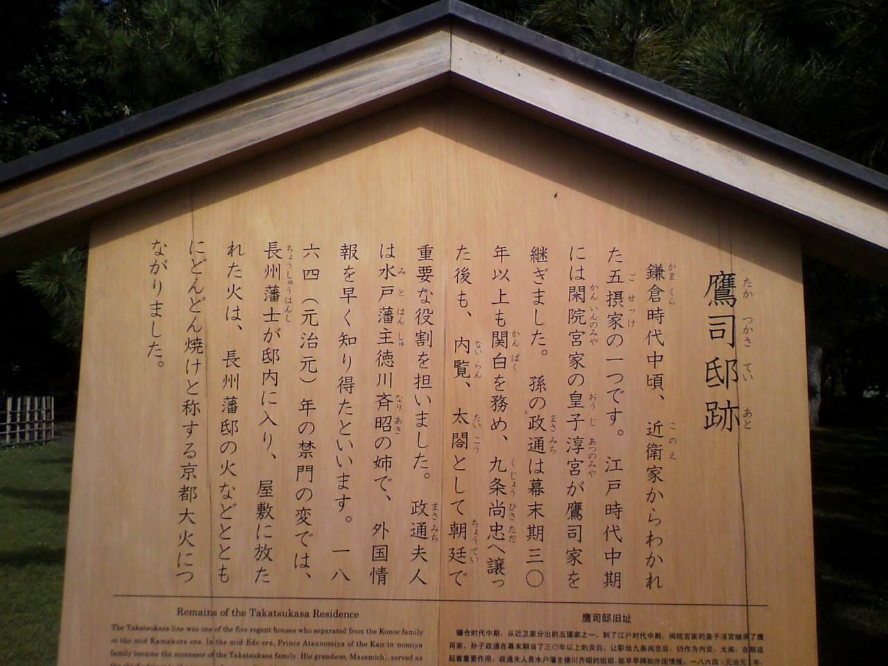 京都御苑内、堺町御門から入って正面辺りのエリアが五摂家のひとつ、鷹司家の邸宅の跡です。