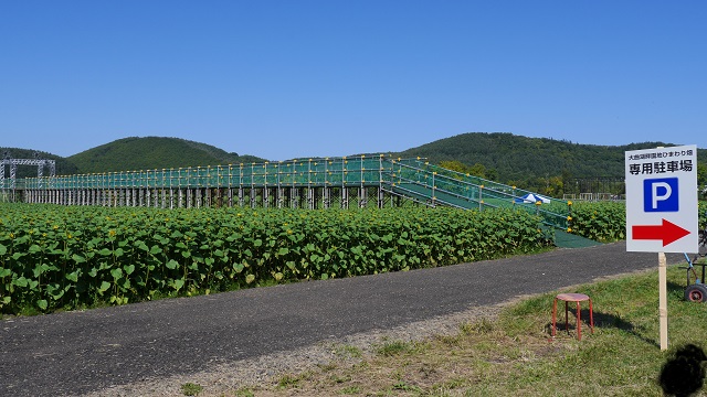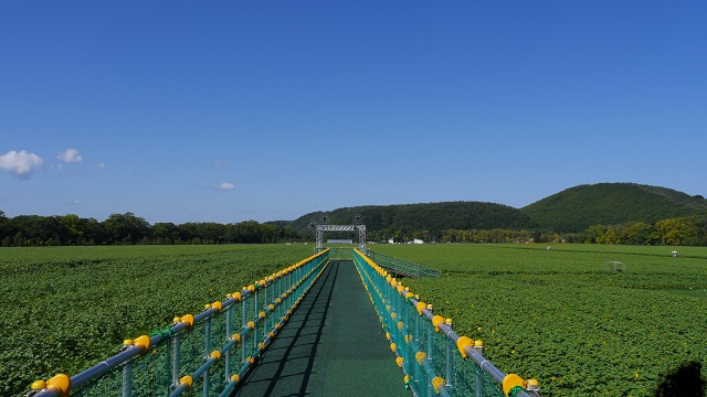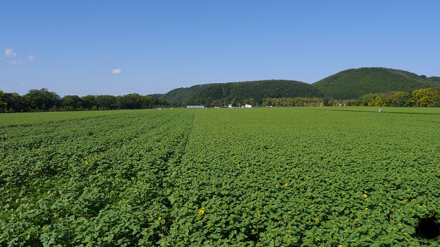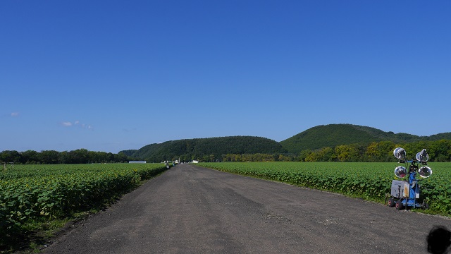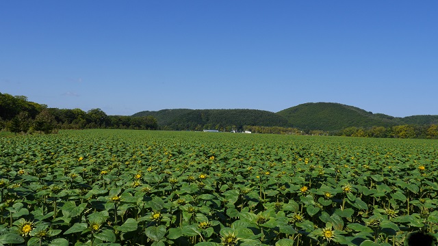 道内にいくつかあるひまわりの観光ポイント。9月にピークを迎えるという事前情報のもと、期待して訪れるも目の前には一面の緑色の風景。視界一杯の黄色い風景は得られなかった。すでに咲き終わった後かと思いきや、この1週間後に満開を迎えたようで今年は10月に入る直前が見どころのようだった。ひまわりは見られなかったがほどほどのコスモスは観察できた。