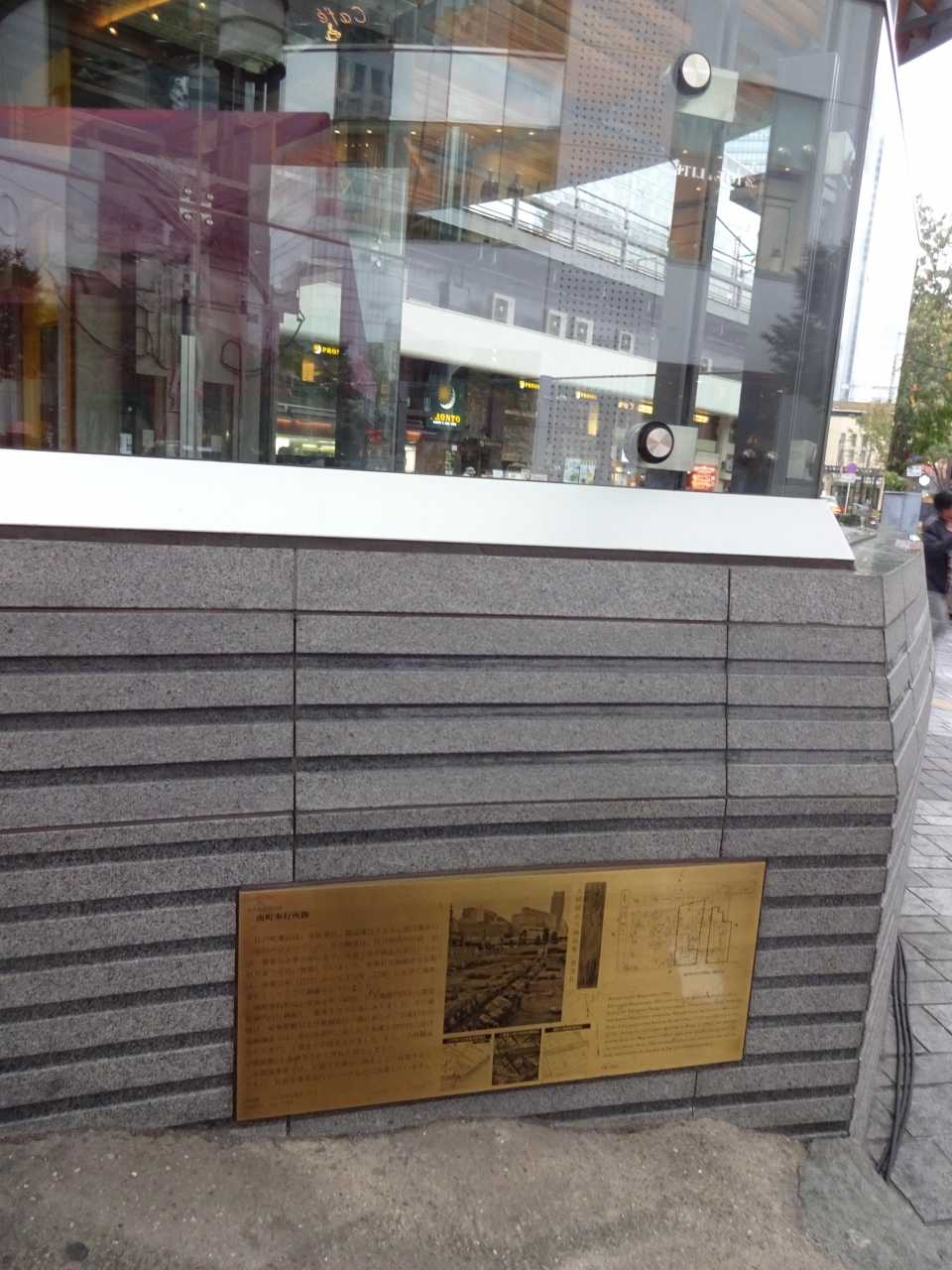 有楽町の銀座方面へつながる広場にある地下鉄への入口の壁際にプレートがあるだけ。探しても、簡単には見つからない。