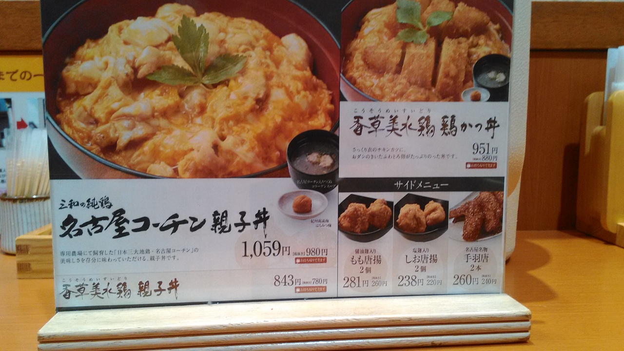 本社は愛知県で名古屋コーチンの養鶏もしているようで、お勧めは「名古屋コーチン親子丼」1,059円。