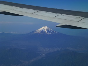 東京国際空港(羽田)から出雲縁結び空港に向かう日本航空の飛行機の中から、きれいに富士山が見えました。乗ったときは左の窓側から見ることができました。普段見る富士山とは印象が違い、上空から見る富士山も素敵でした。
