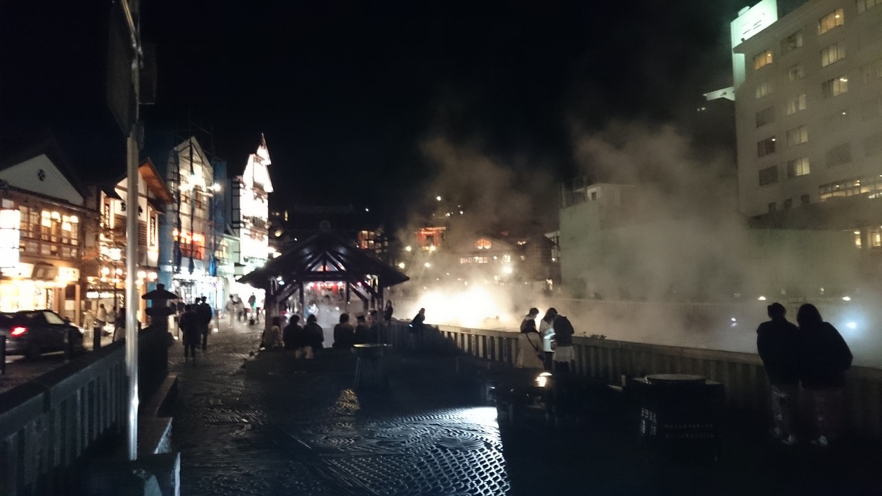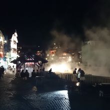 特に秋以降は気温が夜になると一気に下がるため湯畑から吹き上がる湯気が増えて、そこにライトがあたると白く反射し、何も見えなくなり、幻想的になります。
