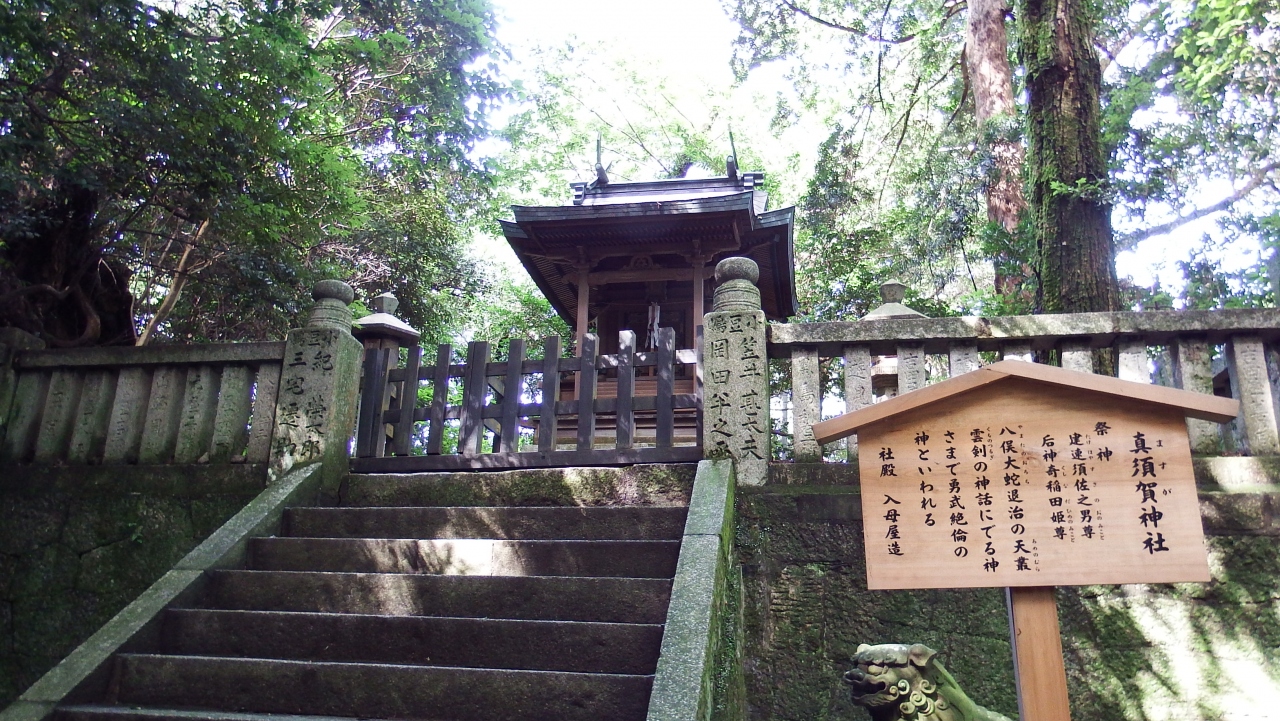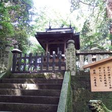 闇峠を過ぎ、連籬橋を渡ると、正面突き当たりにある。御祭神は、建速須佐之男尊・奇稲田姫尊であり、建速須佐之男尊というのはスサノオのことである。天叢雲剣でヤマタノオロチをぶっ殺すという勇ましい神様。ちなみに御本宮の祭神がオオモノヌシであり、スサノオはその先祖である。