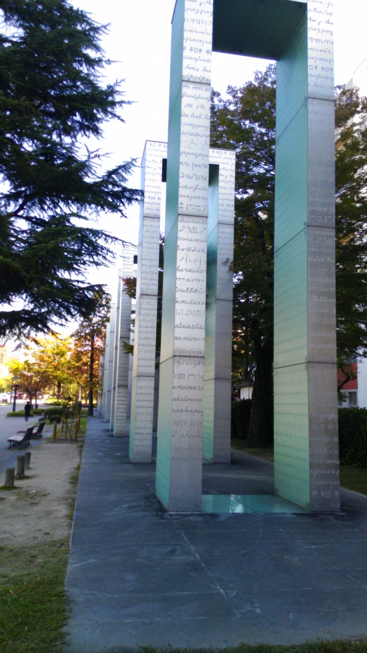 近くのアステールプラザでの催し物があった際、少し時間があったので平和公園に行ってみました。平和公園から、平和大通りを渡ったところにあります。10の門が一列に並んでおりそれぞれの門には19カ国の言葉で「平和」という言葉が刻まれています。