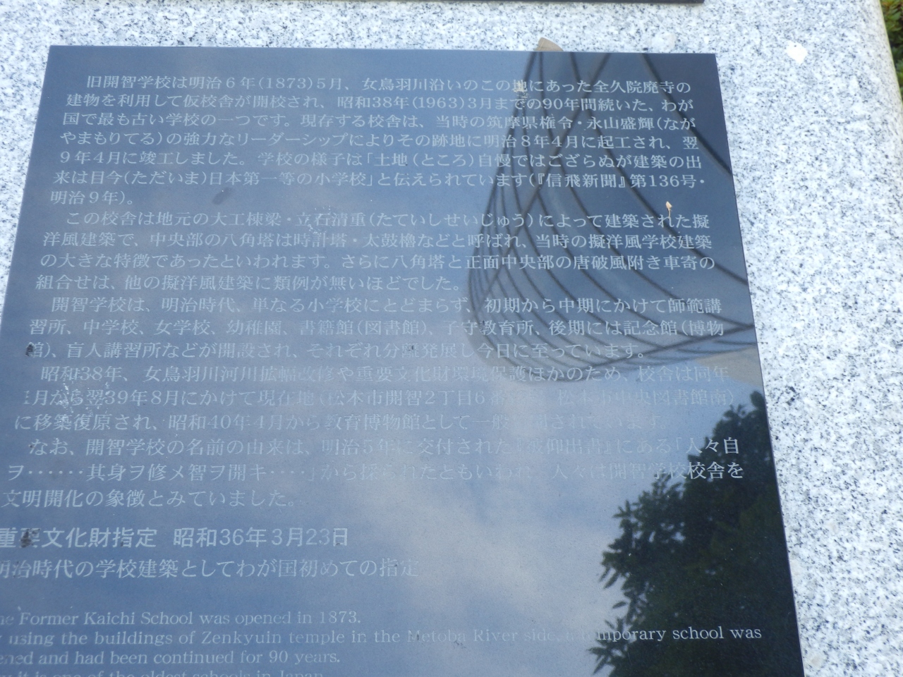 松本市内散策の目玉は松本城、お城葉じっくり見学できたが大阪行のしな乗車まで残り時間わずかしかなく城の北にある旧開智学校見学は断念、帰路についたが途中、旧開智学校跡と記した石碑がありました、開校当初は女鳥羽沿いのこの地記載されていた、昭和38年まで続いたわが国最古の学校の一つであるそうです、参考資料+*現地に設置の説明用石柱