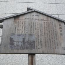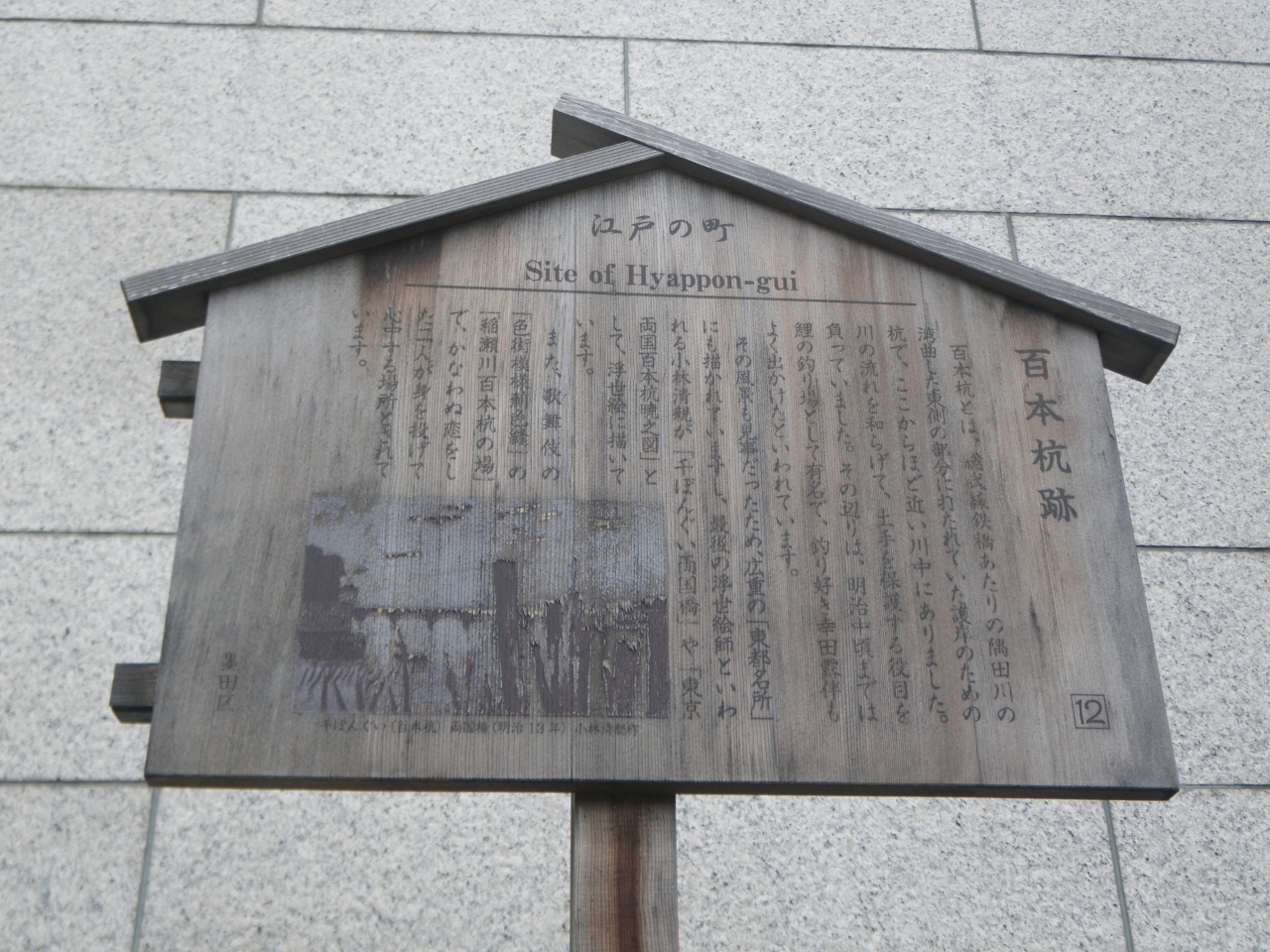 両国駅近くのビルの前に高札がありました。両国国技館と道路を挟んだ向かい側あたりです。隅田川土手の保護のため、川に多数打ち込んだ杭のことで、両国界隈で育った人にとっての原風景だったそう。両国橋東詰にも案内板がありました。