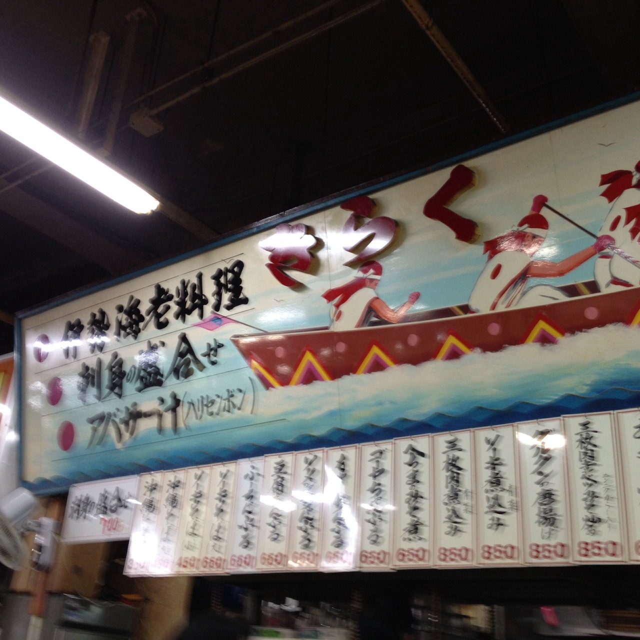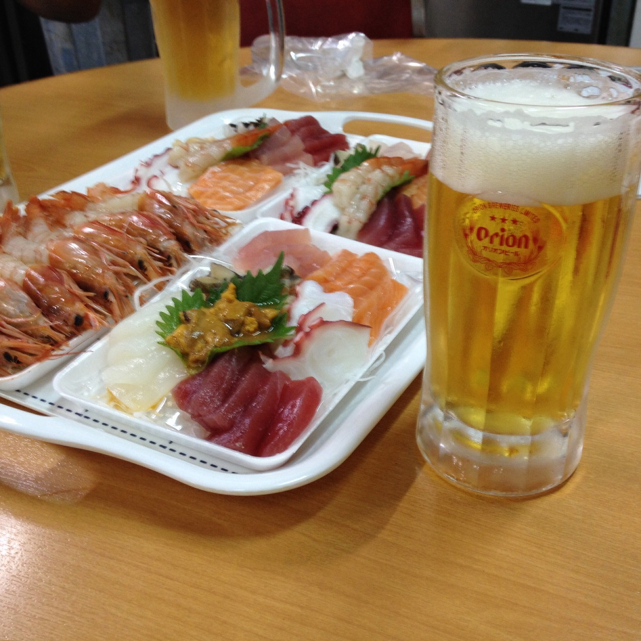 お酒を飲む前にお刺身が食べたく牧志へ。今回のメニューは1Fでお刺身パックを購入し2F「きらく」さんで刺身持込み&ちゃんぷる&ビールを食べました。夜の早い時間帯でしたが地元の方、アジア系外国人の方、修学旅行生風の方などで賑わっていました。