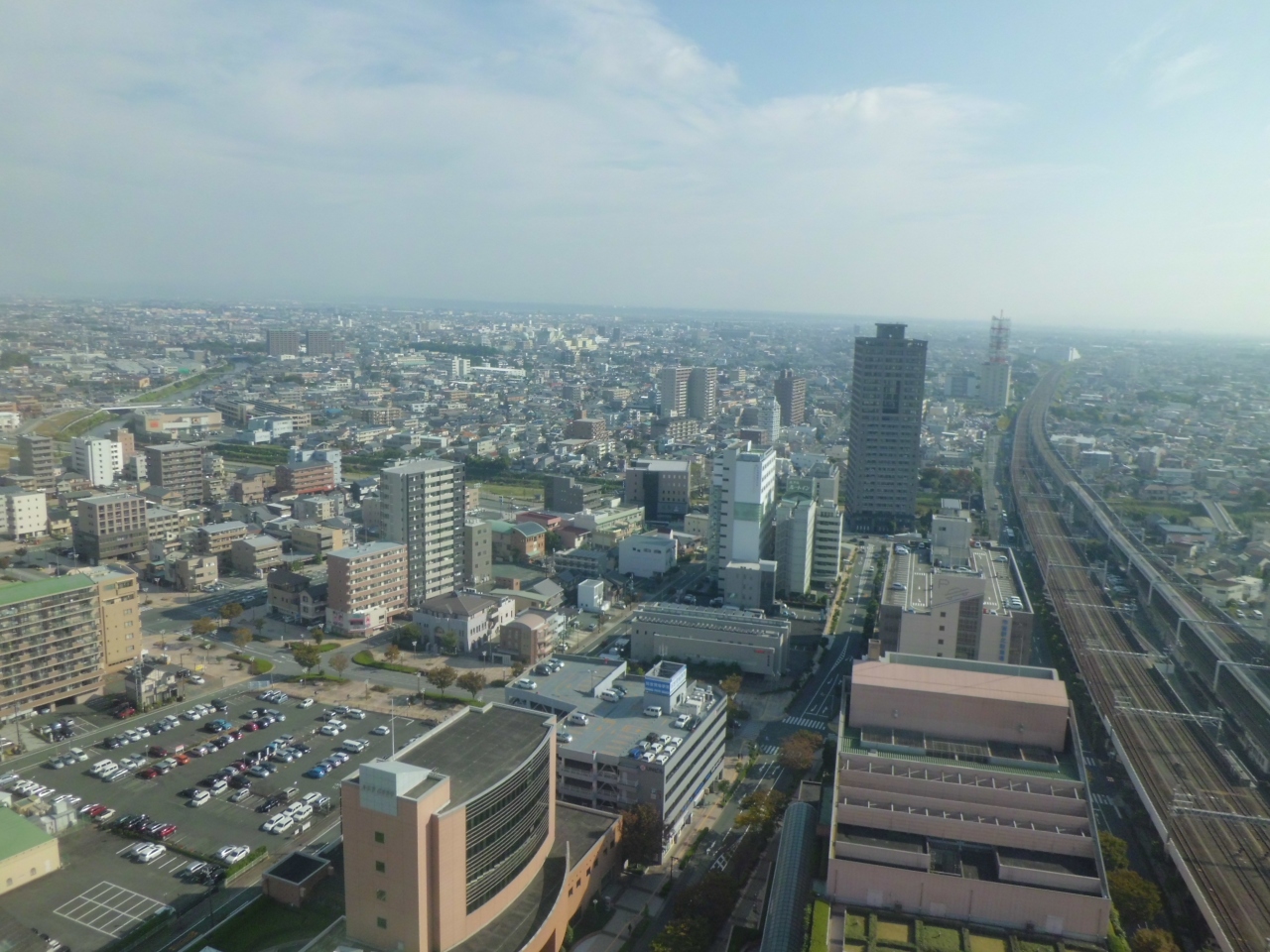 浜松駅かの2階から、デッキ、動く歩道を通るので、雨にも濡れずに行くことができます。ホテルとオフィスの高層ビルです。ホテルの45階は展望回廊となっていますが、入場料が500円かかります。オフィス階のエレベーターホールからも展望が開けます。
