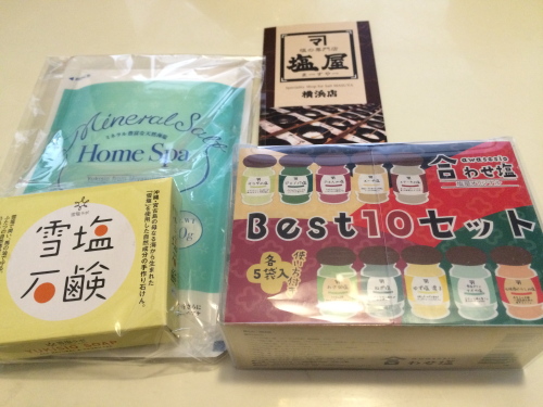試食して甘さの中に塩味があり美味しかったのでふわふわ塩と、スクラブ塩と食べられるくらい安全だという石鹸のセット、いろんな塩が10種類入っているセットを購入しました。