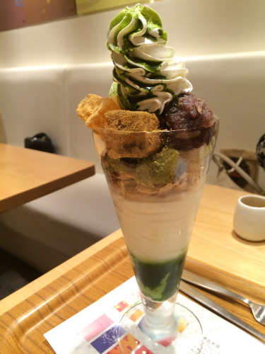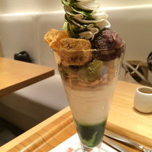 大きなわらび餅が3個、抹茶アイスクリームに抹茶シフォンケーキ、玄米フレーク?、一番下には濃厚な抹茶プリンが入っていて、大満足です。