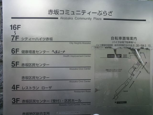 赤坂区民センターは、赤坂コミュニティぷらざの3階以上にあり、受付は3階です。
