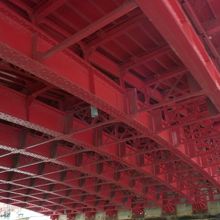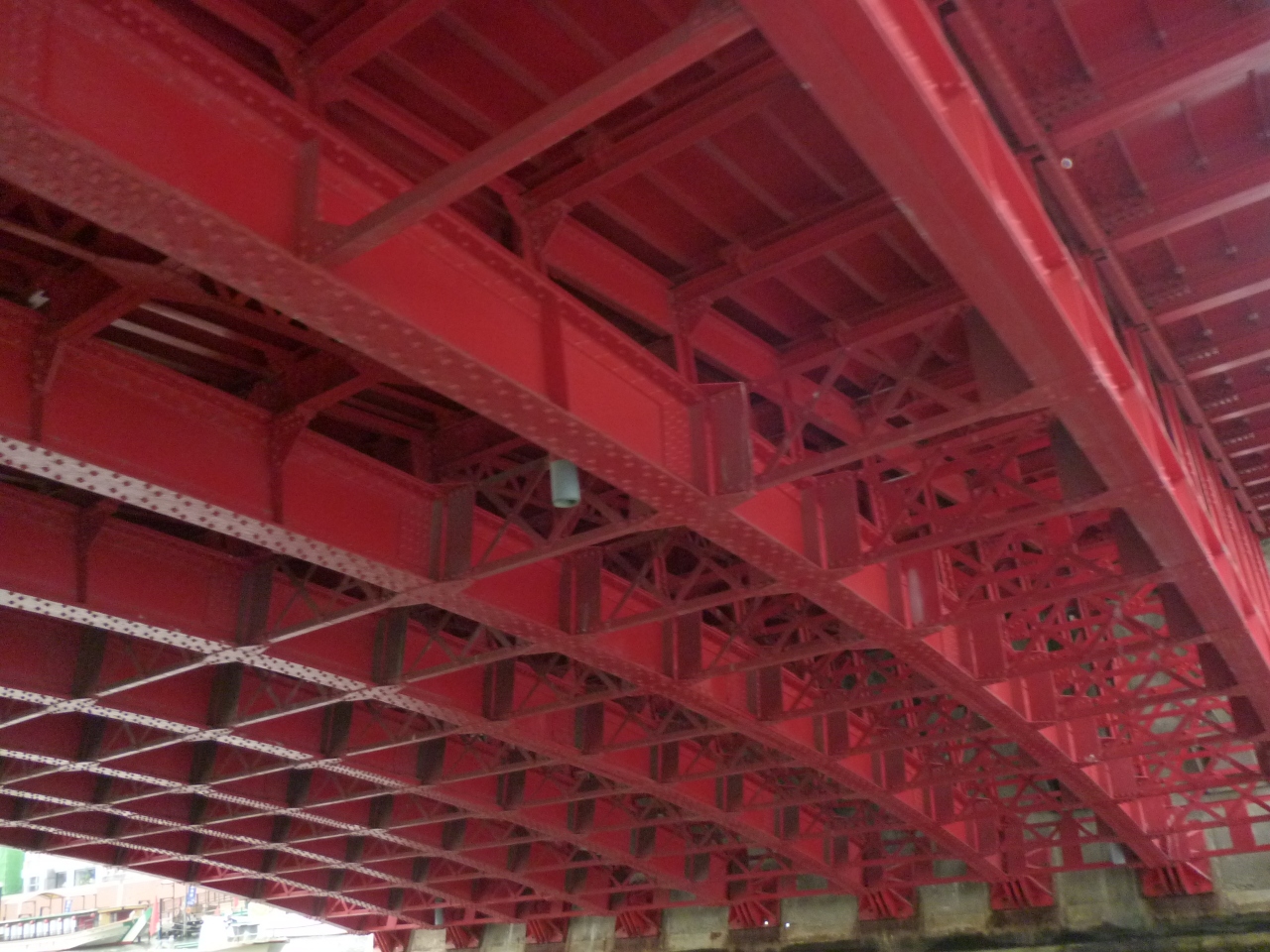 隅田川下りを楽しみました。最初にくぐる橋です。下から見上げると、赤い色が鮮やかでした。近くには、スカイツリーや、ビール会社のオブジェが見えました。浅草寺から近いので、橋の上にもたくさんの観光客の人がいました。