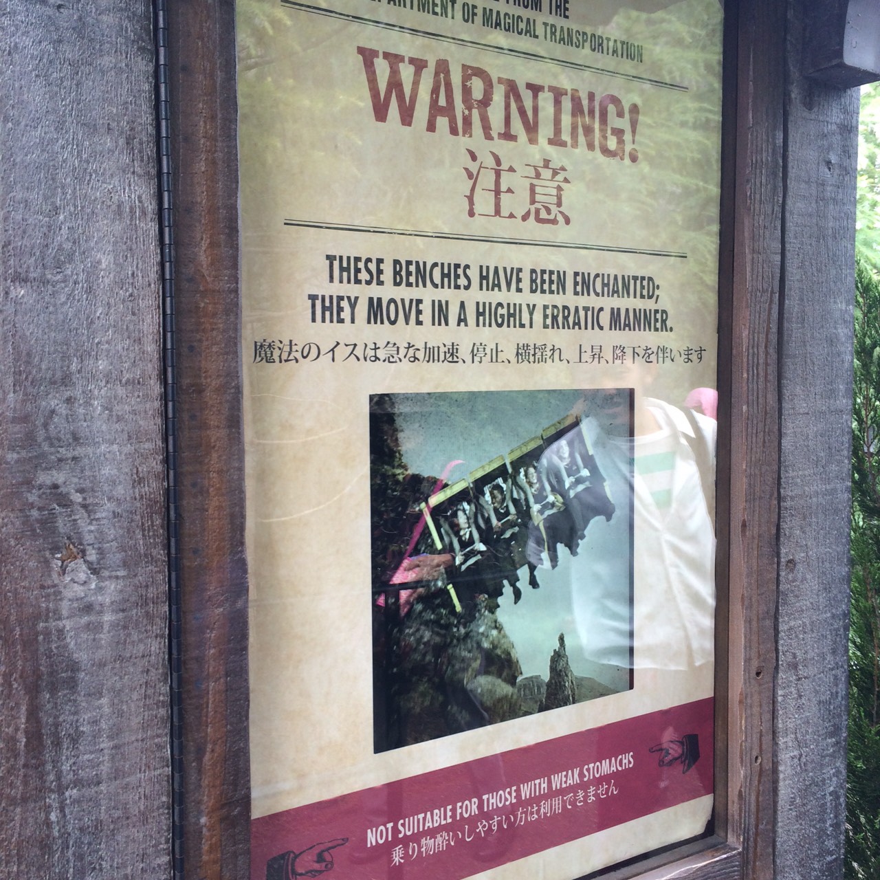 一応警告は出ていたのですが、ハリーポッターのアトラクションだし、テレビのレポートでも景色をすごく褒めていたので、あまり気にせずに乗ったのですが、かなりジェットコースター感の強いアトラクションで、ジェットコースターが苦手で高いところもだめな私にはかなり不向きなアトラクションでした。