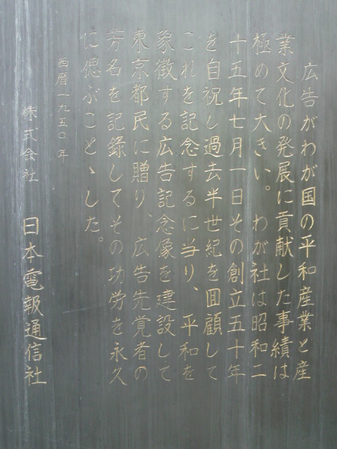 広告記念像は、日本電報通信社(現在の(株)電通)が作製したもので、広告の日本文化に対する貢献を顕彰しています。