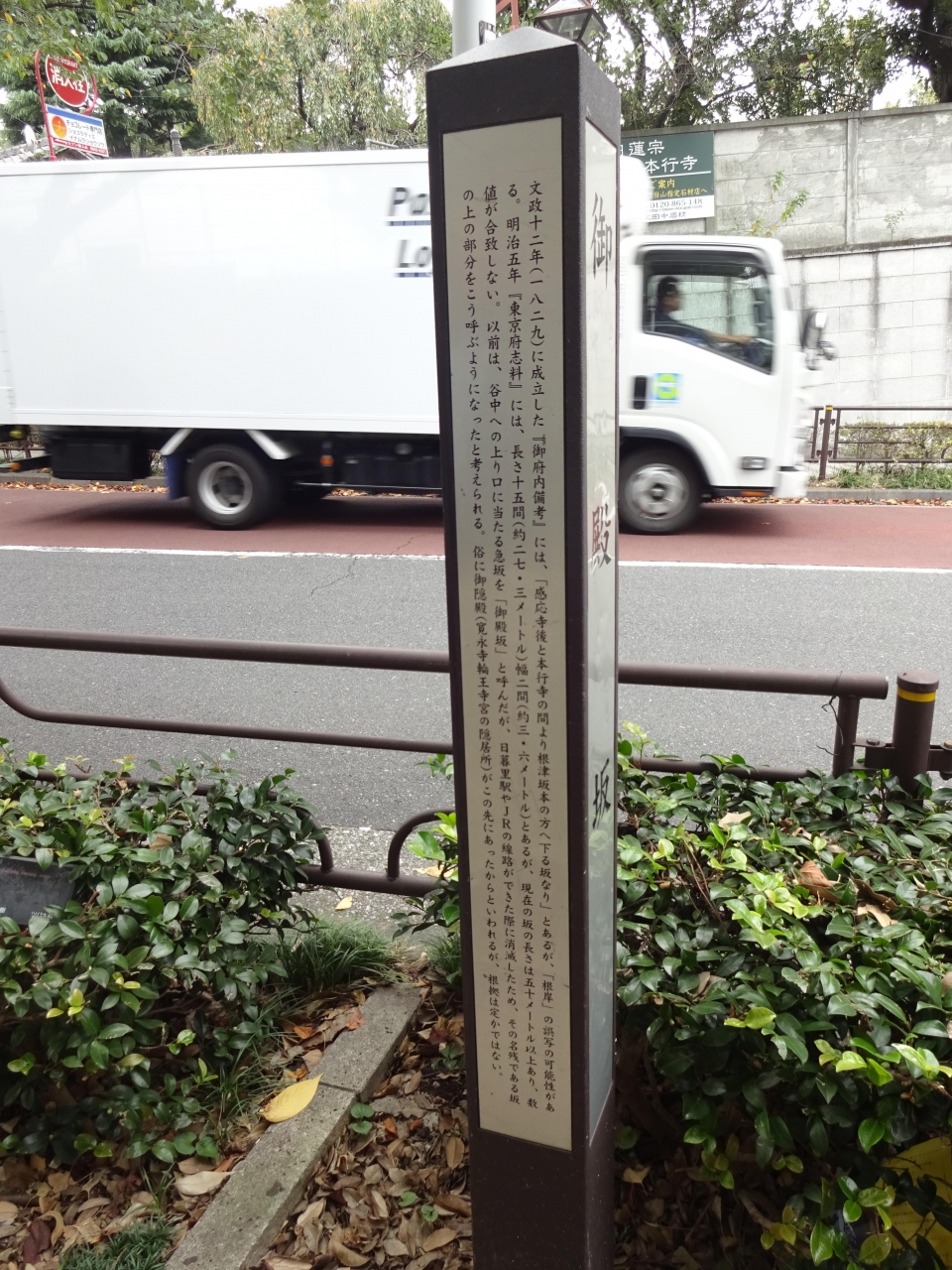 北改札を出て、谷中銀座方向に歩いて行こうとしたら、すぐに道しるべと案内板が立っていた。