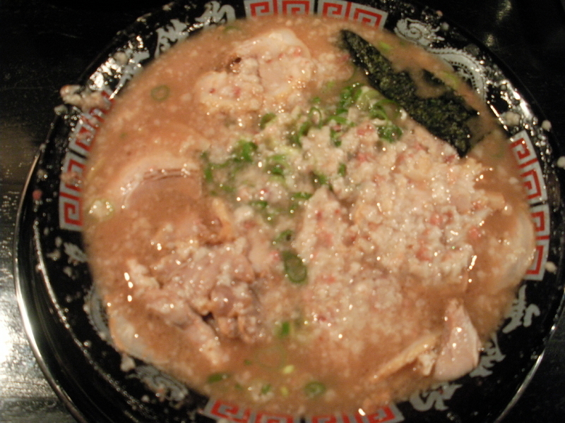スープの粘度は札幌「佳」レベル。粘度に負けるのか塩梅は薄く、卓上調理量を追加、温度は熱いとは言えない。麺は中太麺、若干短い。ネギは切り方が乱雑、もう少し薄切り希望。麺完食後、物足りさを感じる。スープ完飲するか迷ったが、替玉追加。細麺の存在を知り細麺指定。細麺は旨いが、これがなかなかの量である。再度調味料を追加投入する。どうにか麺完食。具の薄豚ばら肉を完食。丼半分を温くなったスープが目の前に