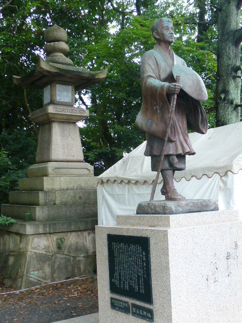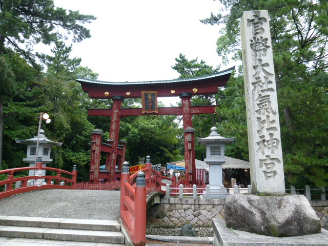 氣比神宮は702年の建立で約1300年の歴史があります。JR敦賀駅から歩くには少々距離がありますのでバスまたはレンタサイクルを利用するのも良いでしょう。正面にある高さ11mの鳥居は重要文化財に指定され、木造建築では日本三大鳥居のひとつと言われています。お祭りがあるのでしょうか露店が建っていました。また境内には松尾芭蕉像などがあります。この地域は芭蕉ゆかりの地なのでしょうか、他にも観ることができます。訪ねてみてください。