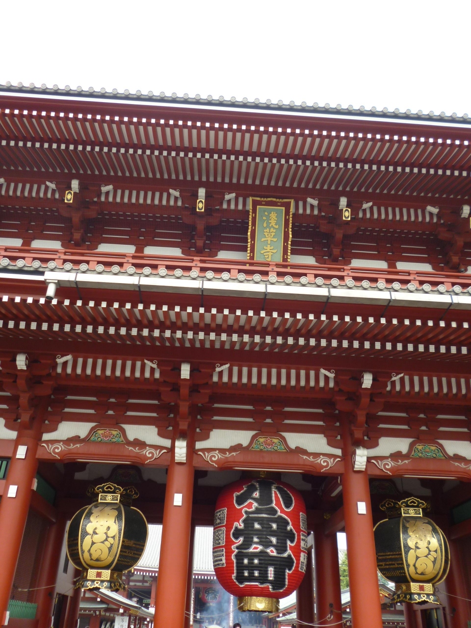 浅草寺の本堂の前に、大きな山門がありました。二階建てです。提灯も大きいです。左右には、災難厄除けの仁王様が安置されています。門をくぐると、大きな「わらじ」がありました。ここからスカイツリーも見えました。
