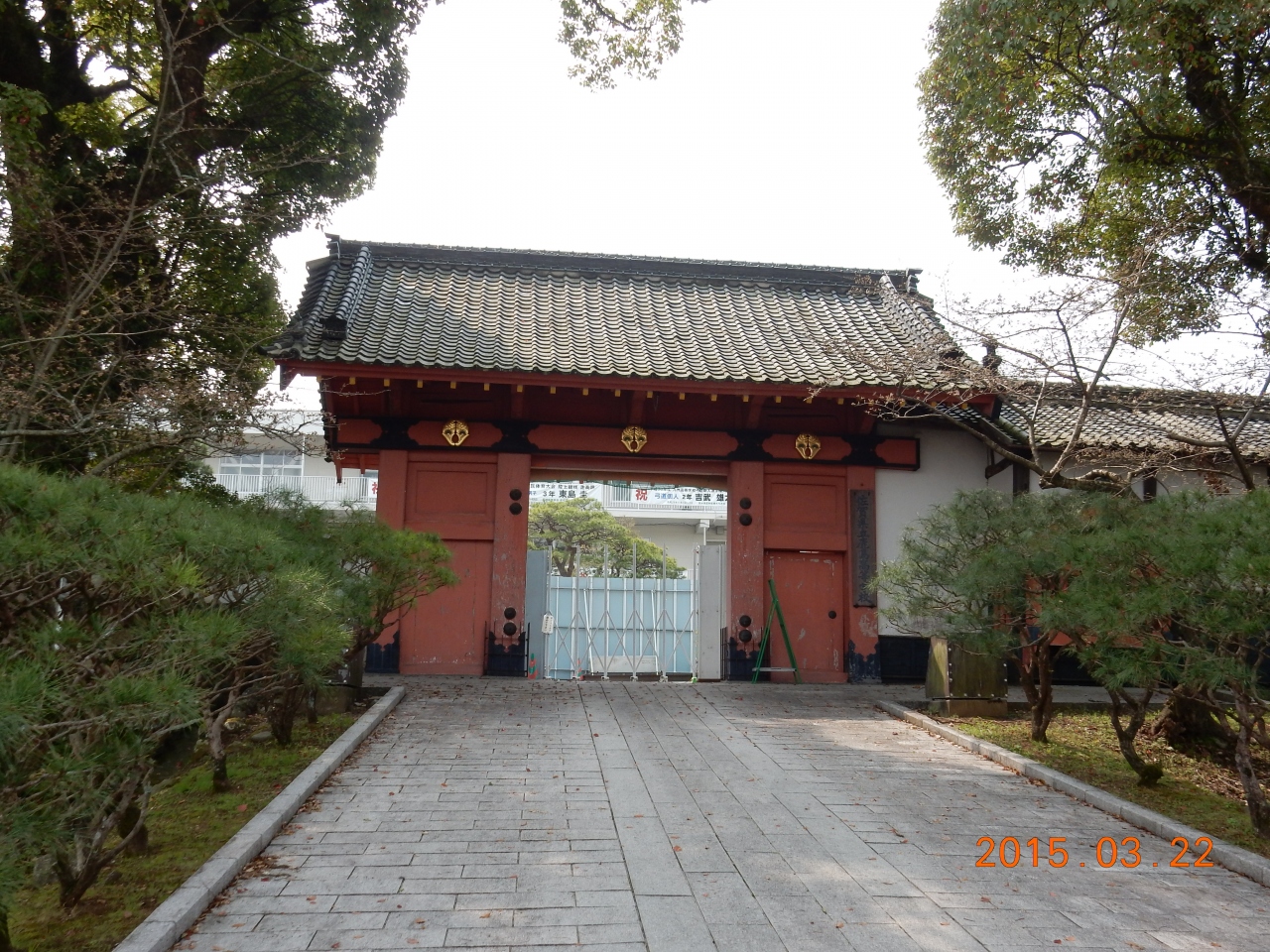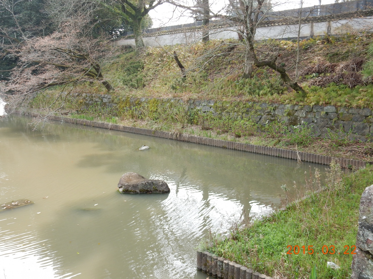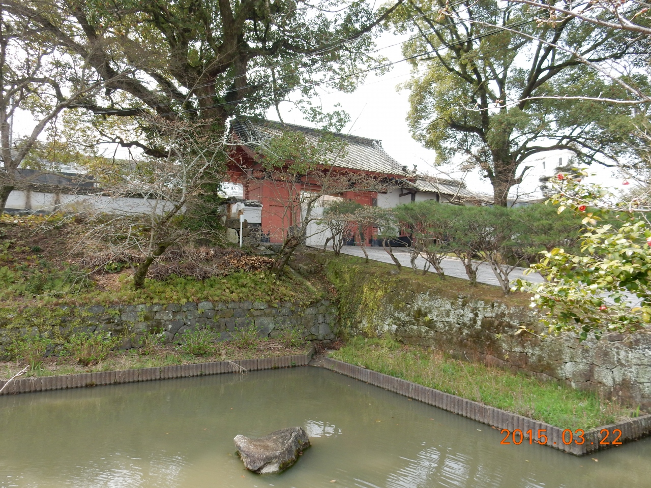 100名城巡りのついでに鍋島藩支藩の鹿島城に寄りました。城址公園になっていて無料の駐車場があります。駐車場をスーッと走って入っていったら、ドスンと段差がありビックリしました。注意してください。結構立派な石垣が残っています。門も残っており、高校の門として使われているようです。