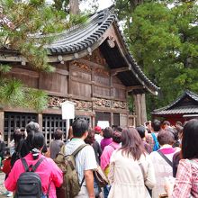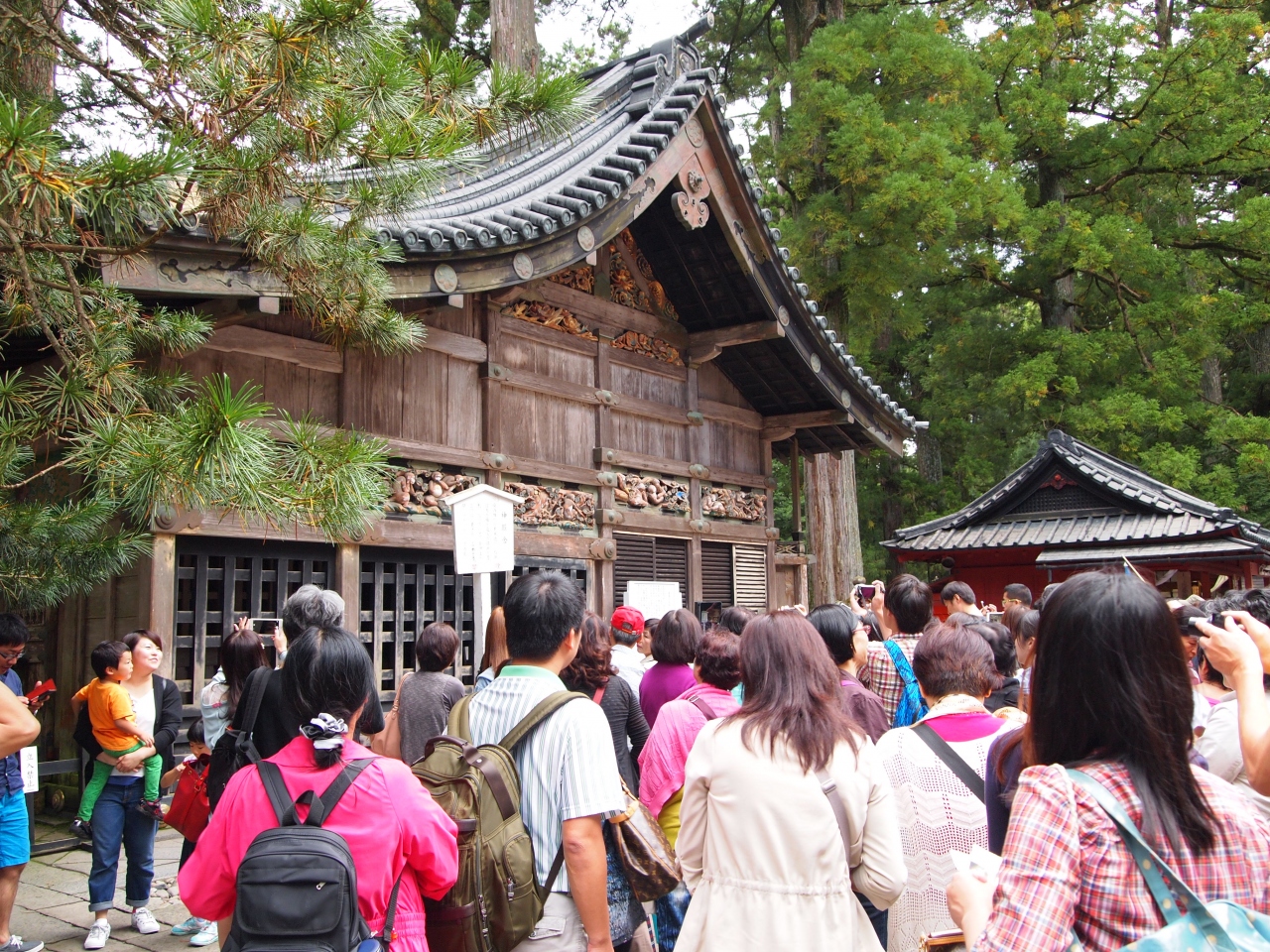中でも「見ざる・言わざる・聞かざる」の三猿の彫刻が有名で、東照宮内でも一番の人の集まりでした。