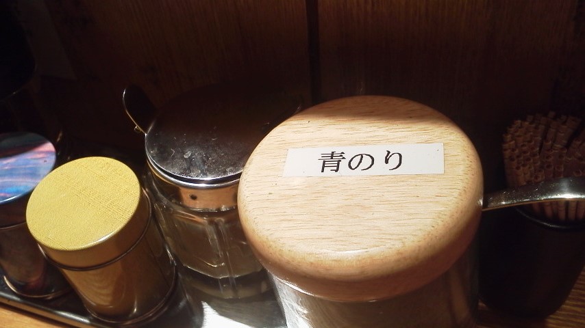 卓上には、黒胡椒、にんにく、一味唐辛子の他に柚子七味と青のりがあるのが特徴。