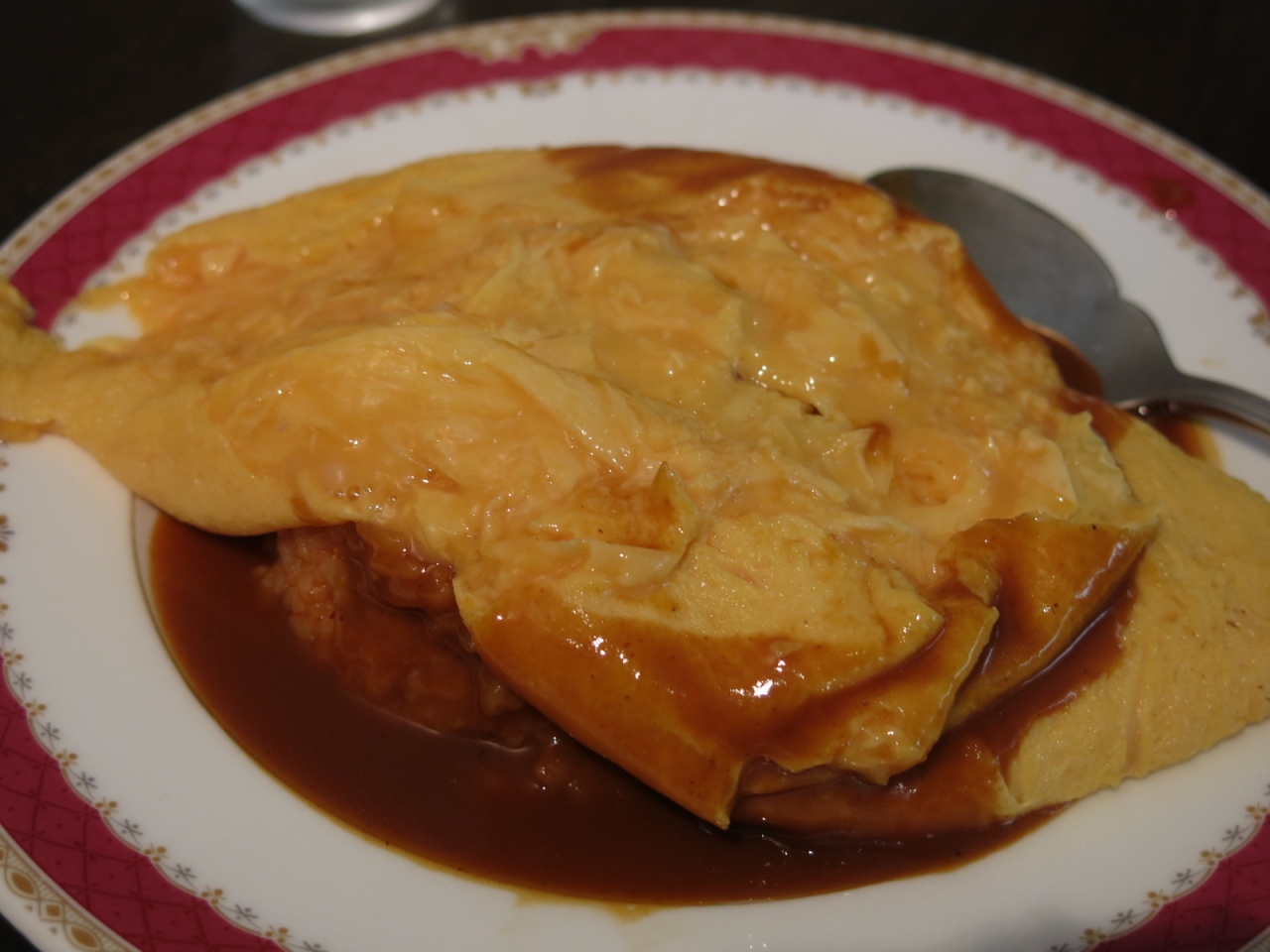 オムライス以外には近江牛ハンバーグ、エビフライがありましたが、基本的にオムライス専門店っていう感じのお店です。ライスの上に載った卵は、中身が半熟で分厚く、スプーンを入れると”ふわとろ”って感じでライスを覆い尽くしてきましたよ。PS:オムライスのトッピングでハンバーグやエビフライを追加できます。