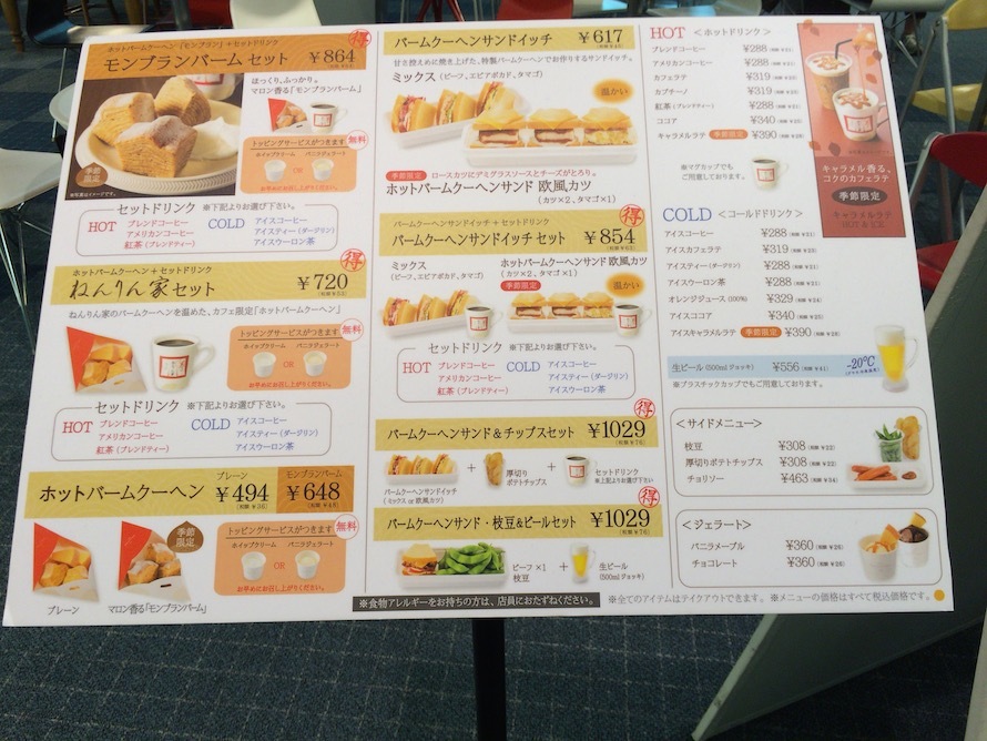 バームクーヘンで有名なねんりんや。値段はそこそこしますが、プレーンバームはなかなか美味しい。ここではバームクーヘンサンドなど変わったものもありますし、セットにするとだいぶ値段が下がります。そして、飲み物だけだとかなり安い!お持ち帰りにも重宝します。