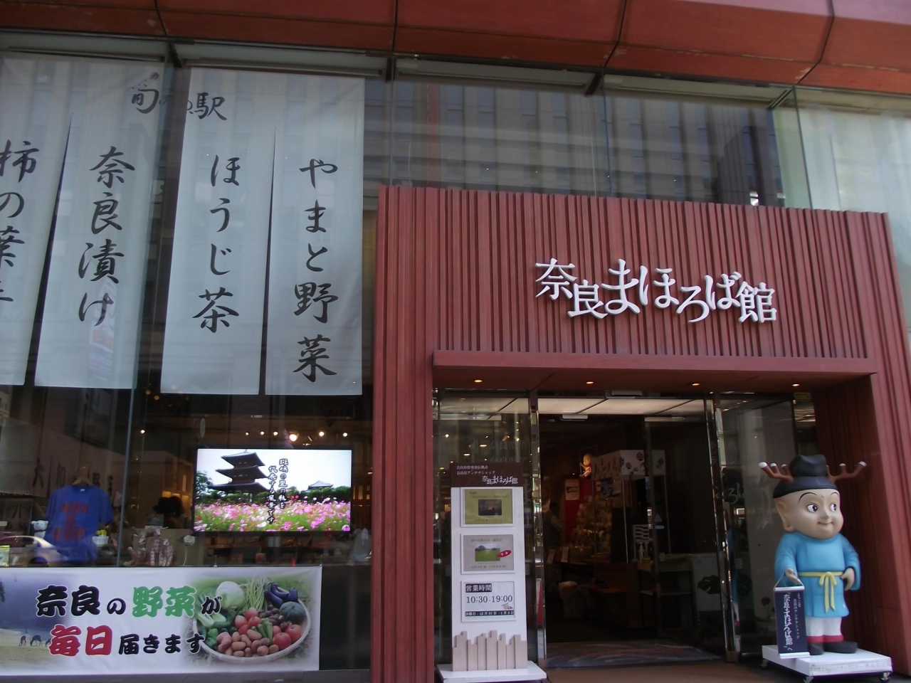 ここ 奈良まほろば館 は、奈良県のアンテナショップで、出入口には等身大の せんとくん が立っています。