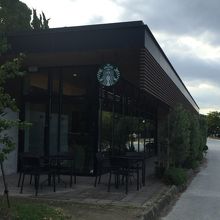 「公園の景観の維持に努めたデザイン、建設をし、環境に配慮したグリーンストア」という位置づけで、コーヒーの豆かすと公園の落ち葉をたい肥に活用したり、コーヒーの豆かすと間伐材と混ぜ合わせて作ったテーブルがあったりとエコな取組みも魅力。