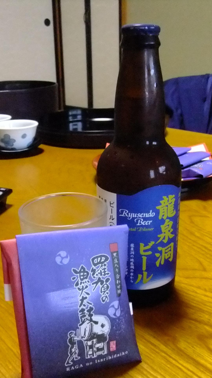 岩手の観光地龍泉洞を訪問しました。この観光会館には駐車場があったので、車を止めるがてら、店内で買い物をしました。ちょっと歴史を感じさせる雰囲気の建物でした。軽食がいただける場所があって、1階はお土産屋さんでした。お土産と洞窟のセット券なども販売していました。龍泉洞ビールを買いました。さらっっとしたビールでした。