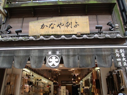浅草、伝法院通り沿いに有る「かなや刷毛」は大正3年創業の老舗です。ここは店名通りで刷毛とブラシの専門店です。今や工場で大量生産出来る時代なのにここでは1本1本熟練工による手造り取り扱う種類も多く遠方からわざわざ買いに来る人も大勢居るほどです。