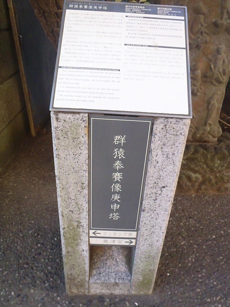 群猿奉賽像庚申塔へ行くには弁天橋から参道を進み青銅製の鳥居、瑞心門、辺津宮、中津宮と参道階段を登って、奥津宮に行く途中、山二つの付近にあります。