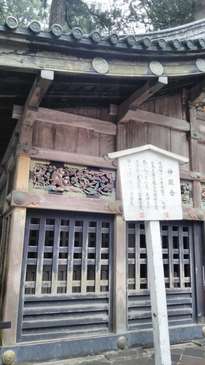 境内唯一の素木造りだそうで、中は馬を扱う役人の詰所で畳じきになっているそうです。そして何故ここに猿の彫刻?と、不思議に思っていましたが、昔から猿が馬を守り、病を治すとされていることから、長押上に猿の彫刻があるそうです。今回初めて知り、とても勉強になりました。
