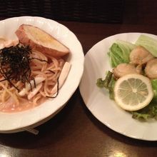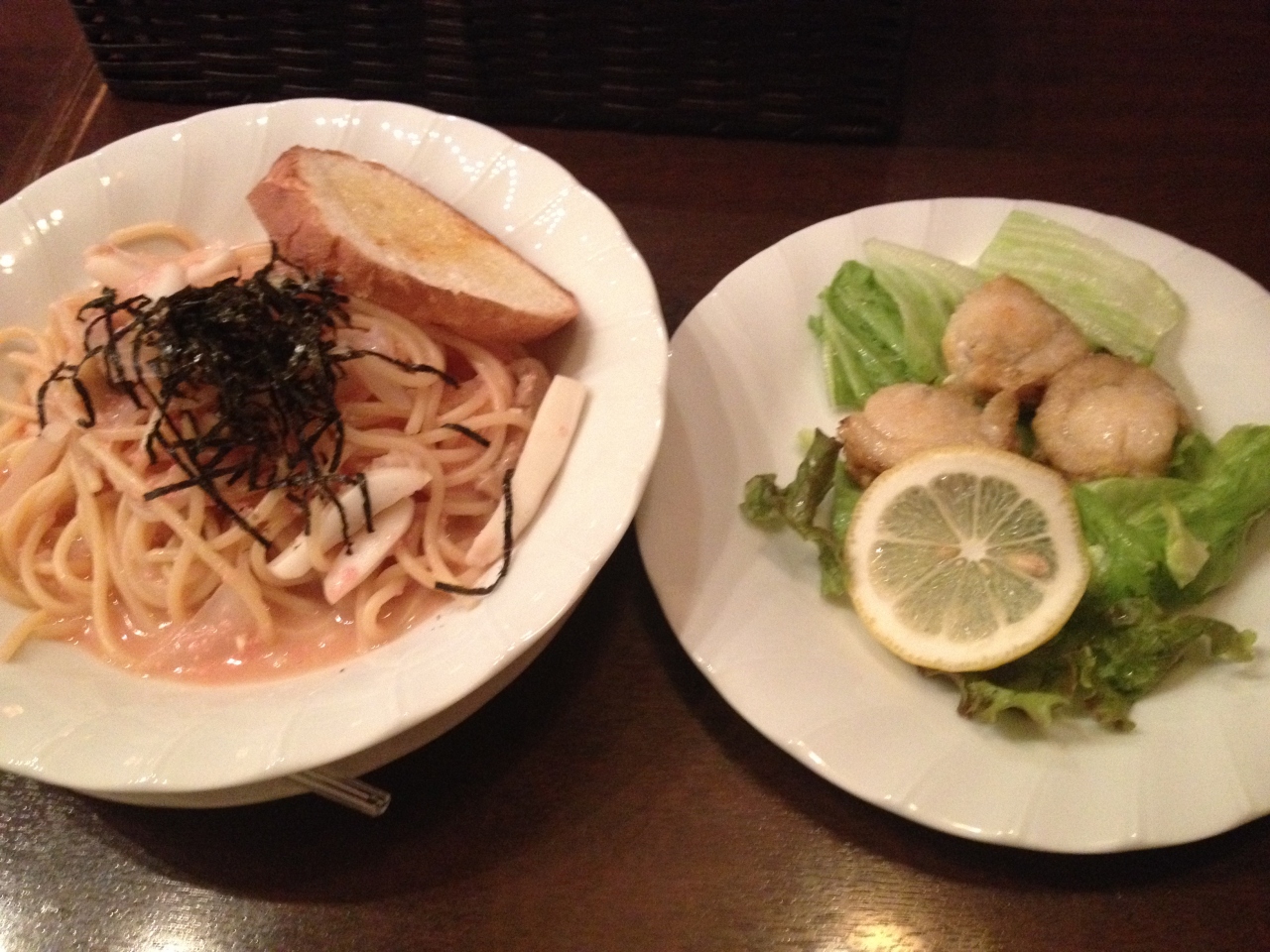 明太子のパスタとホタテのムニエルをオーダー、計900円弱。