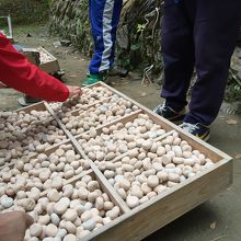 川の対岸の小さな穴をめがけて運だまを投げ入れます