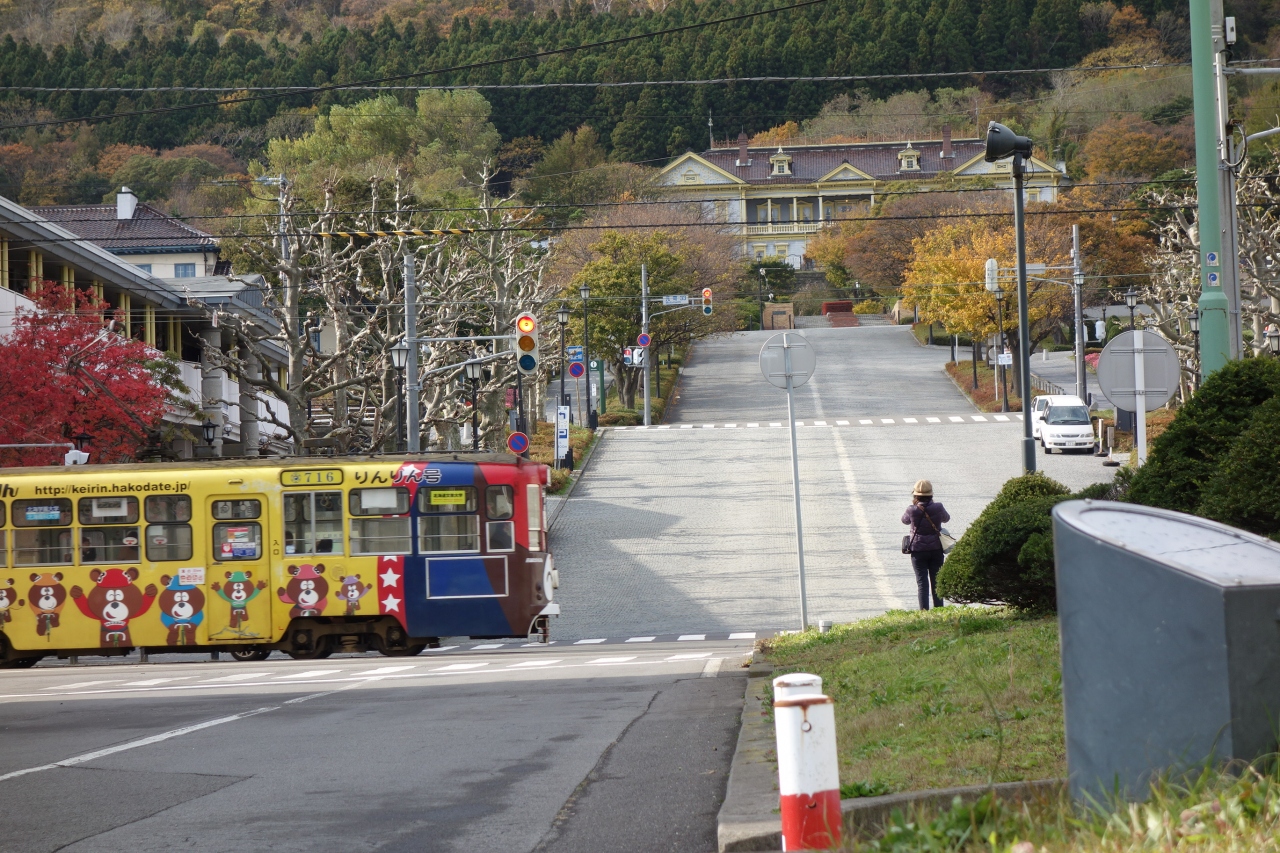 市電に乗って末広町で下車。基坂の下から見上げるとブルーグレーのイエローが目を引く洋館、旧函館区公会堂があります。国の重要文化財に指定されており、バルコニーからは函館港を望めます。10月に行きましたが、周辺の木々が紅葉しとても綺麗でした。