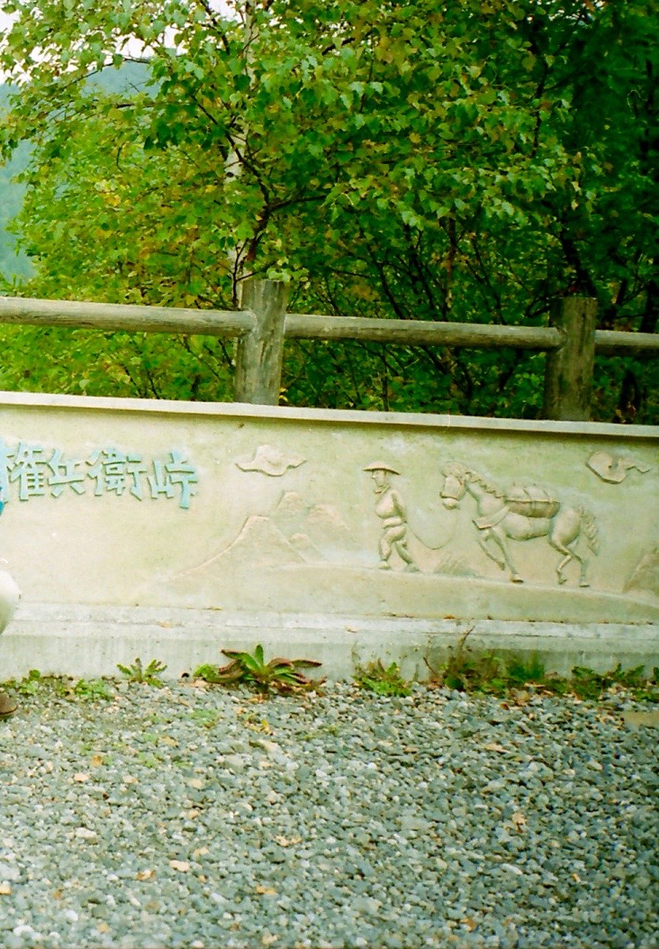 今でこそ峠の下を国道の権兵衛トンネルが貫いますが、かつては国道ならぬ林道が羊腸のごとく狭い山道をたどった先にあった峠でした。峠は車が何台も停めることができるほど広々としていて、権兵衛さん(?)をあしらったレリーフなどもありますが、誰も訪れる人がおらず静かなものです。