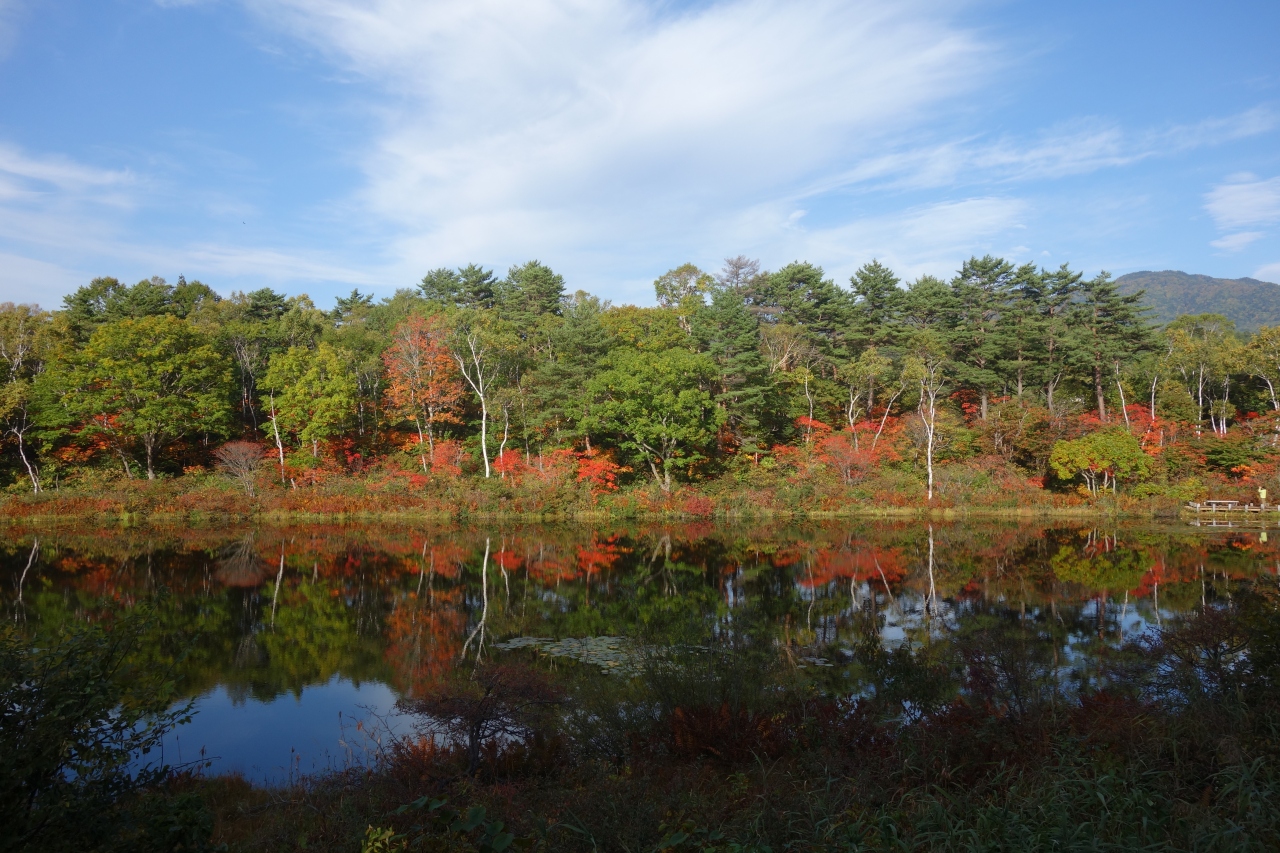 一沼は、志賀高原の紅葉スポットの一つ。志賀高原の中では、それほど標高が高くないにもかかわらず、紅葉の時期は早め。9月下旬に訪れましたが、ウルシが真っ赤に色づいていました。旅の途中何度か訪れましたが、いつもガスがかかっていたのですが、最終日の帰りにようやく晴れの日に一沼の紅葉を目にすることができました。