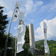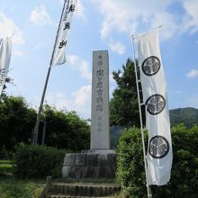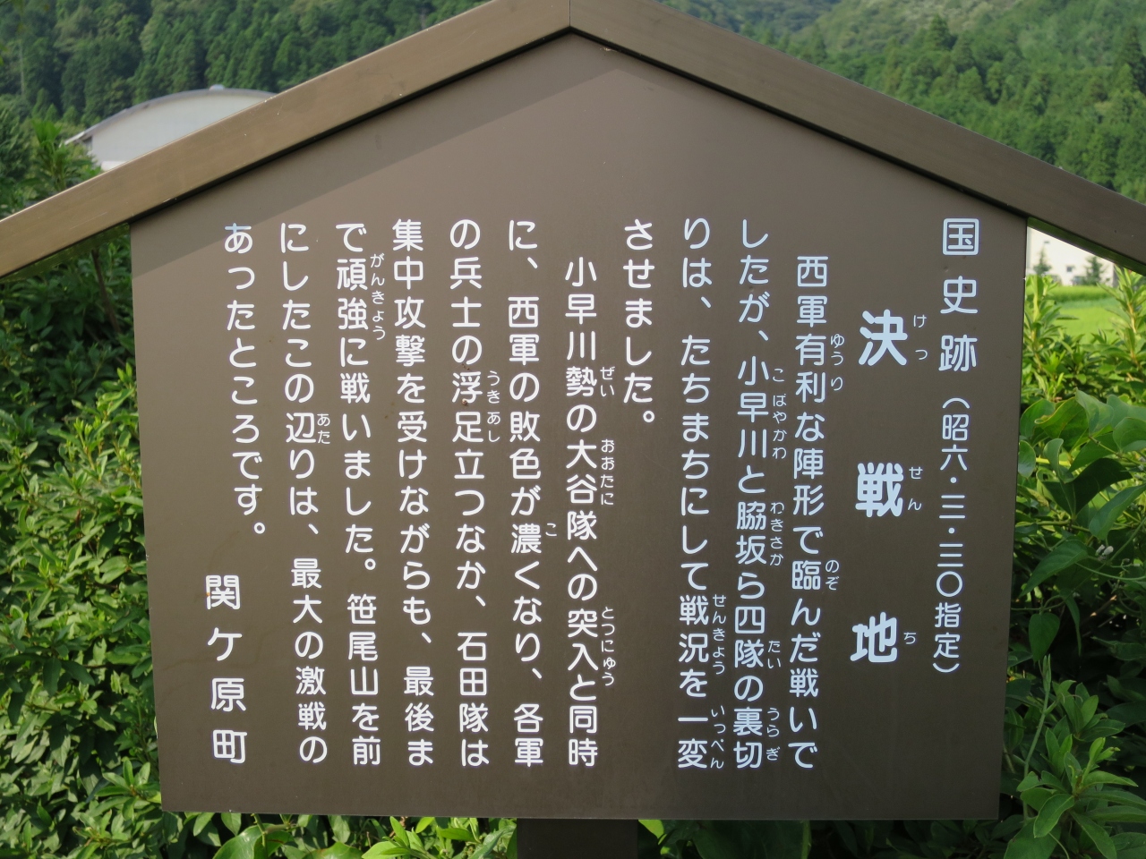 関ヶ原バイパスにあるローソン関ヶ原店の横の道を進んだ田園地帯の中に、天下分け目の戦い、関ヶ原の決戦地があります。小山には大きな「関ヶ原古戦場 決戦地」と刻まれた石碑、その脇には川、石田ののぼり旗がはためき、青空に映えます。