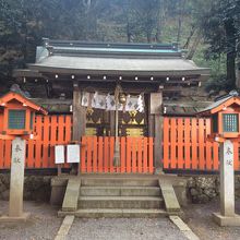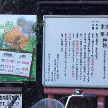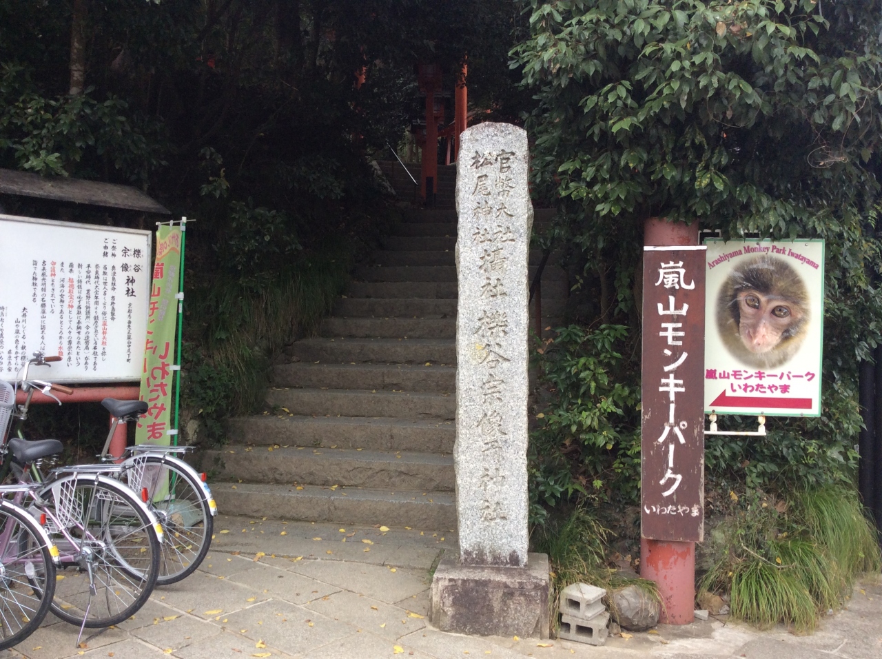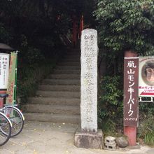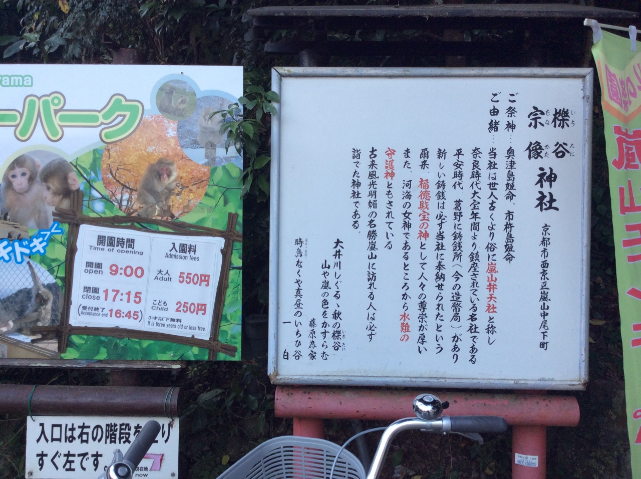 櫟谷宗像神社の看板と嵐山モンキーパークの看板が並んで設置されています。