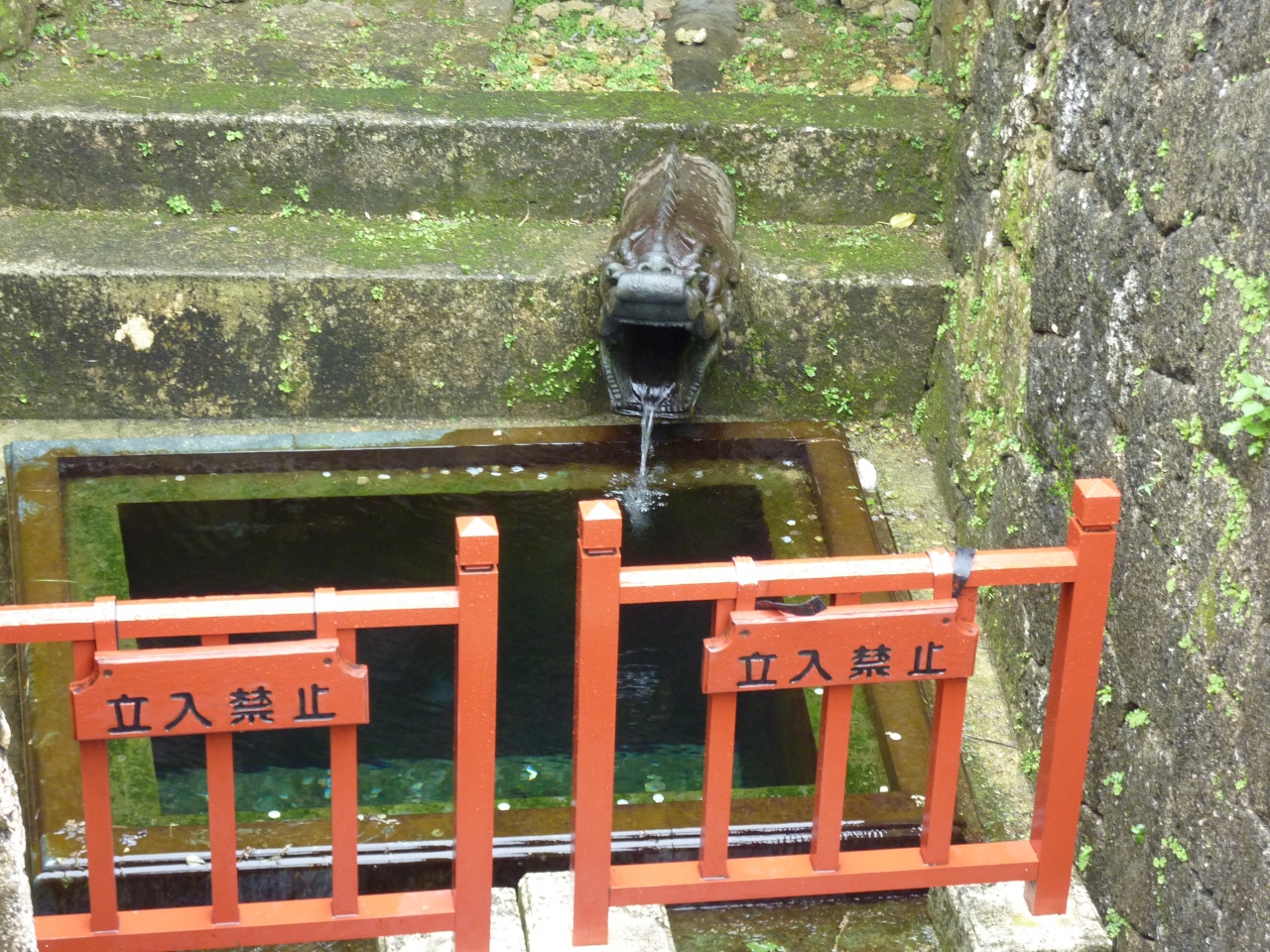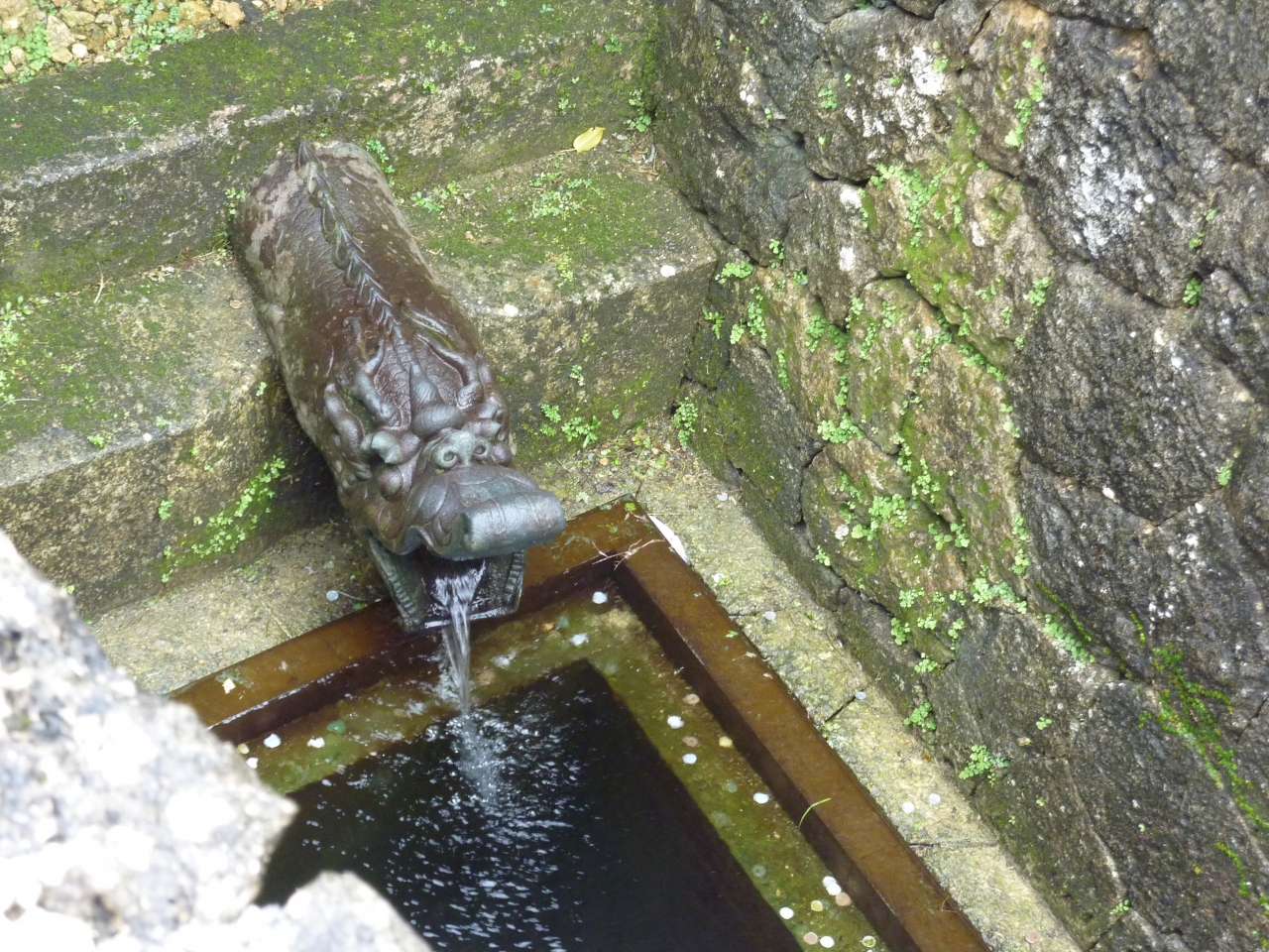 当時の宰相、三司官が1523年に中国から持ち帰ったもので、水を注ぐ石造りの龍の彫刻です。瑞泉門の手前にあり、通路から階段を少し降りた所に龍の彫刻と、その口から湧き出る水をためる枡があります。この枡は立ち入り禁止の看板と小さな門に囲まれていますが、通路から覗き込んでみることができます